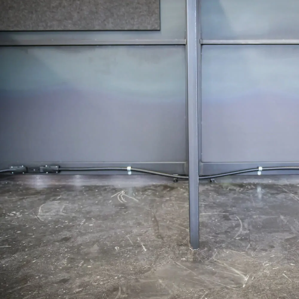 The metal parts of this work cubicle are of carbon steel, in Metallic finishing. The mobile pedestal has been color-matched with the steel, resulting in a powerful Charcoal matte finish.