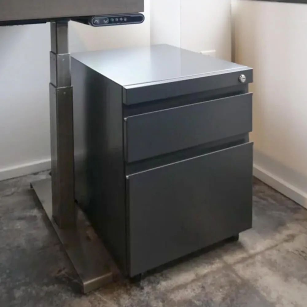 The metal parts of this work cubicle are of carbon steel, in Metallic finishing. The mobile pedestal has been color-matched with the steel, resulting in a powerful Charcoal matte finish.