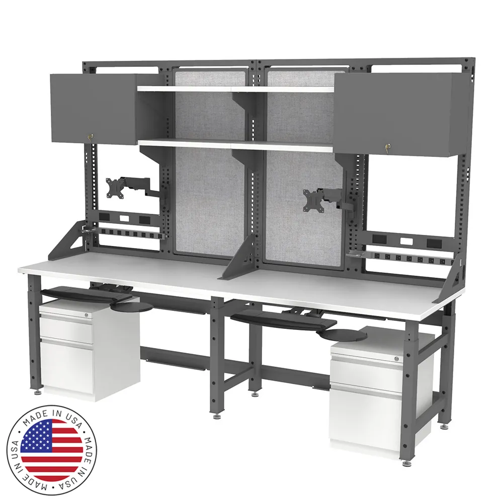 This Two Person Workbench is a workstation designed for tech-intensive environments. It includes a 96x30 inch height-adjustable workbench with a high-pressure laminate worksurface. The setup is equipped with two 48"W x 48"H upper organizer frames, each featuring two fabric panels, two lockable storage bins, four fixed HPL shelves, and two single-screen monitor arms. Additional components include two freestanding box/file pedestals, two keyboard trays, two telecom channels, and two 72"W 15 amp power strips with 8 outlets and a 15-foot cord each. The product is designed to maximize usable space and provide ample power for multiple devices.