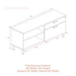 This cozy office cubicle is complemented by a modern credenza which stands independently, featuring open shelves for display and a lockable desk drawer measuring 30 inches wide, ensuring a tidy and clutter free workspace.
