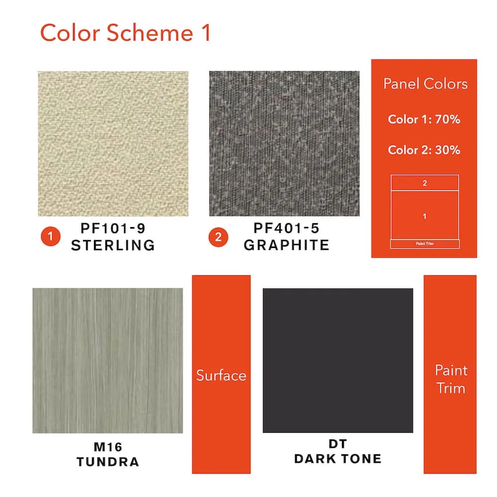 Color Scheme 1: Sterling and Graphite fabrics colors, Tundra laminate for the surfaces. Dark Tone paint trims.