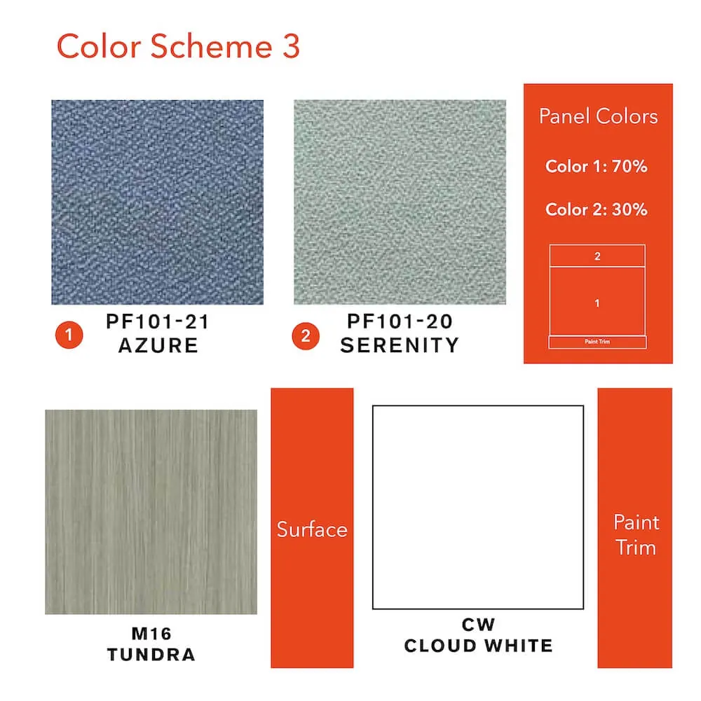 Our modern cubicles boast segmented panels with a delightful twist: two fabric combinations offered in three captivating office color schemes. Choose from the sophisticated Sterling and Graphite fabrics for the timeless look, paired with Tundra laminate surfaces, and accentuated by Dark Tone paint trims. Alternatively, embrace the contemporary vibe of Azure and Sterling fabrics, complemented by Cloud White laminate work surfaces and brightness of the Cloud White paint trims or choose the modern combination of the Azure and Serenity fabrics with Tundra laminate and Cloud White paint trims.