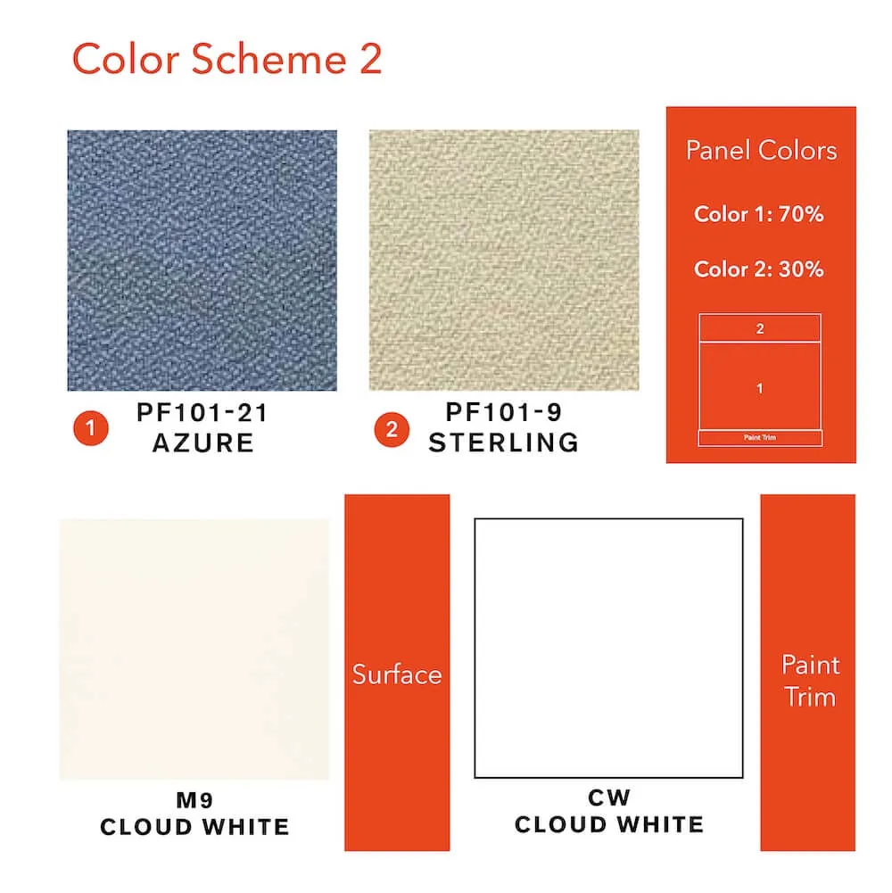 Color Scheme 2: Azure and Sterling fabrics colors, Cloud White laminate for the surfaces. Cloud White paint trims.