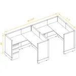 This modular furniture has panels upholstered in Grey/Beige fabric, durable flush-mounted black resin kick plates, metal components powder coated in either White or Silver, and laminate work surfaces available in three colors: White, Medium Tone and Dark Tone. All panel frames and raceways, filing pedestals, overheads and shelves are made from 100% recyclable steel. Configurations that include glass-top panels feature real glass and metal frames.
