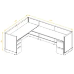 This modular furniture has panels upholstered in Grey/Beige fabric, durable flush-mounted black resin kick plates, metal components powder coated in either White or Silver, and laminate work surfaces available in three colors: White, Medium Tone and Dark Tone. All panel frames and raceways and filing pedestals are made from 100% recyclable steel. Configurations that include glass-top panels feature real glass and metal frames.