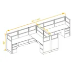 This modular furniture has panels upholstered in Grey/Beige fabric, durable flush-mounted black resin kick plates, metal components powder coated in either White or Silver, and laminate work surfaces available in three colors: White, Medium Tone and Dark Tone. All panel frames and raceways, filing pedestals, overheads and shelves are made from 100% recyclable steel. Configurations that include glass-top panels feature real glass and metal frames.