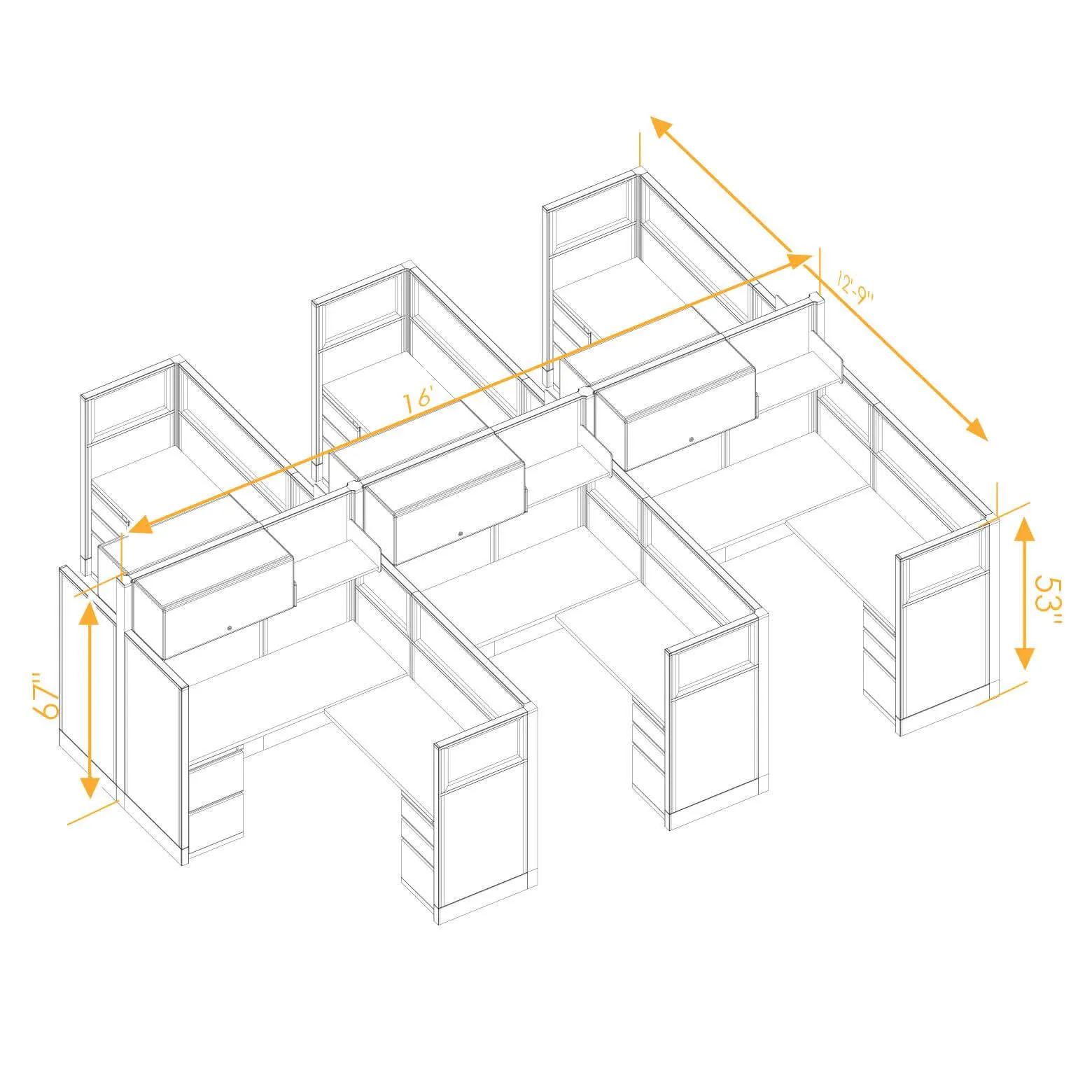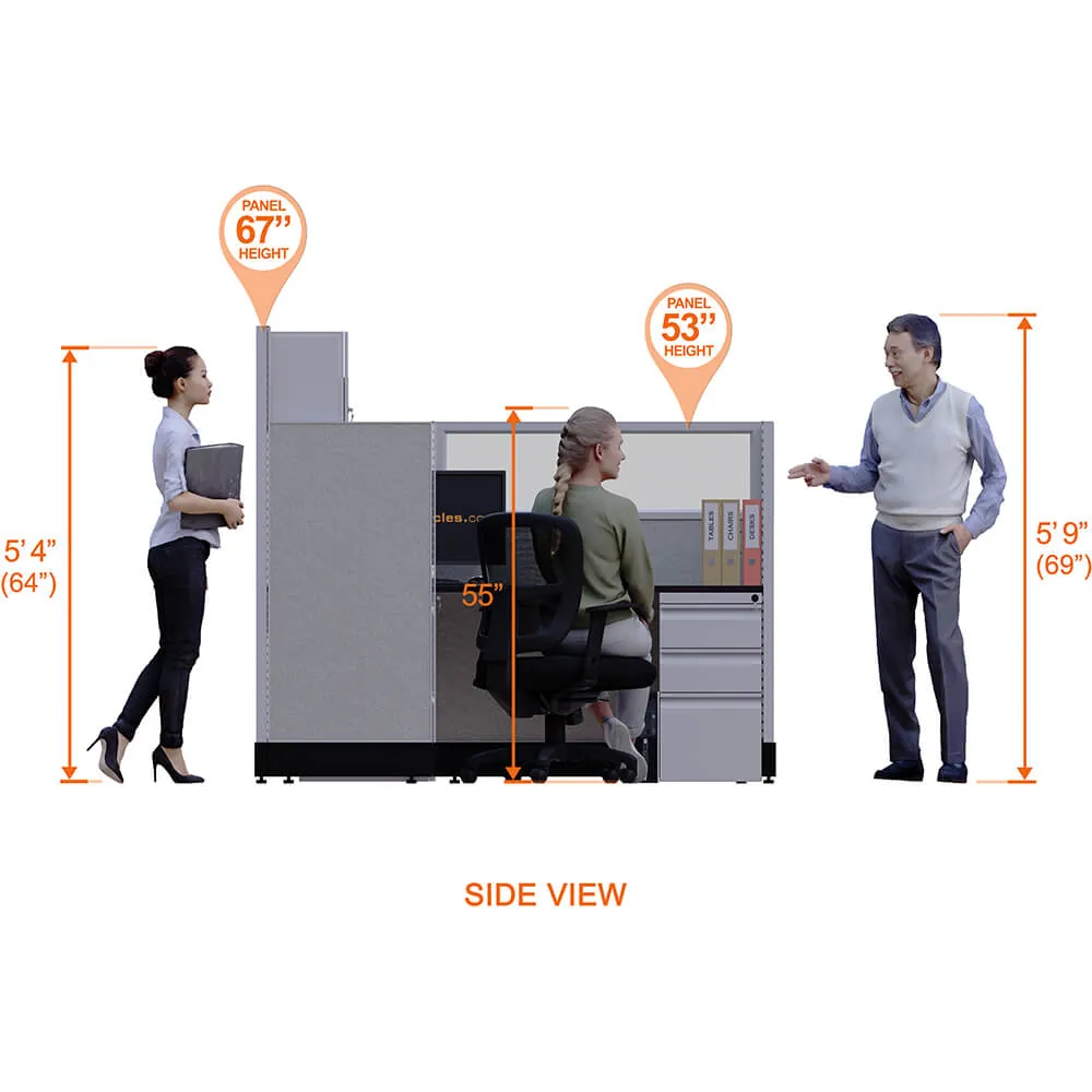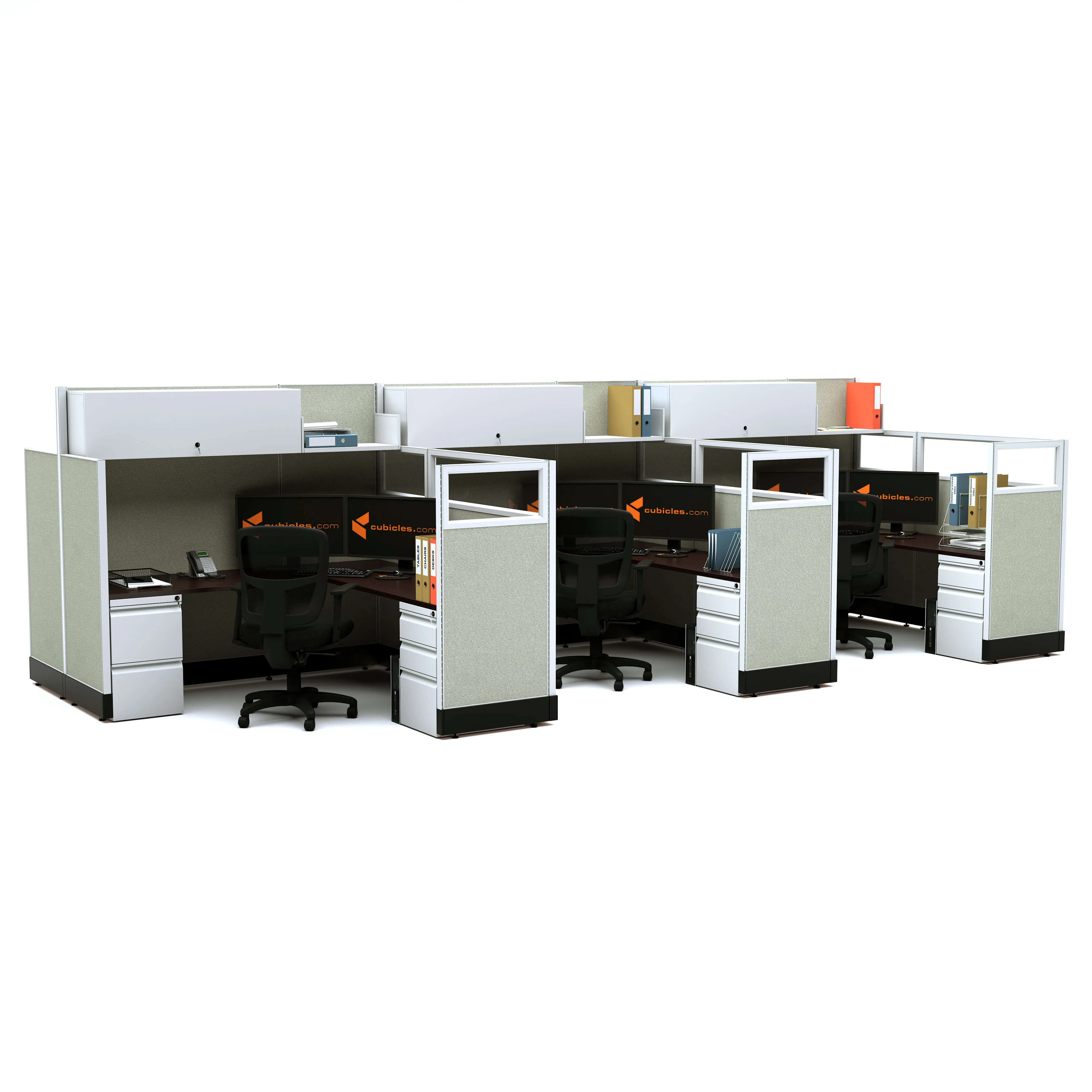Partial Glass Office Cubicles integrate the needed privacy in personal work and storage space to easily adapt your activities and needs to your office surroundings. These 53-67H 6pack Cluster Non Powered office workstations create an area, where your workers can organize and utilize their workspace, with all of their personal items and tools right at the tip of their fingers, while still providing opportunities for great collaboration or informal meetings. They can easily take many forms and arrangements across any office landscape, to accommodate local preferences within a larger system.
