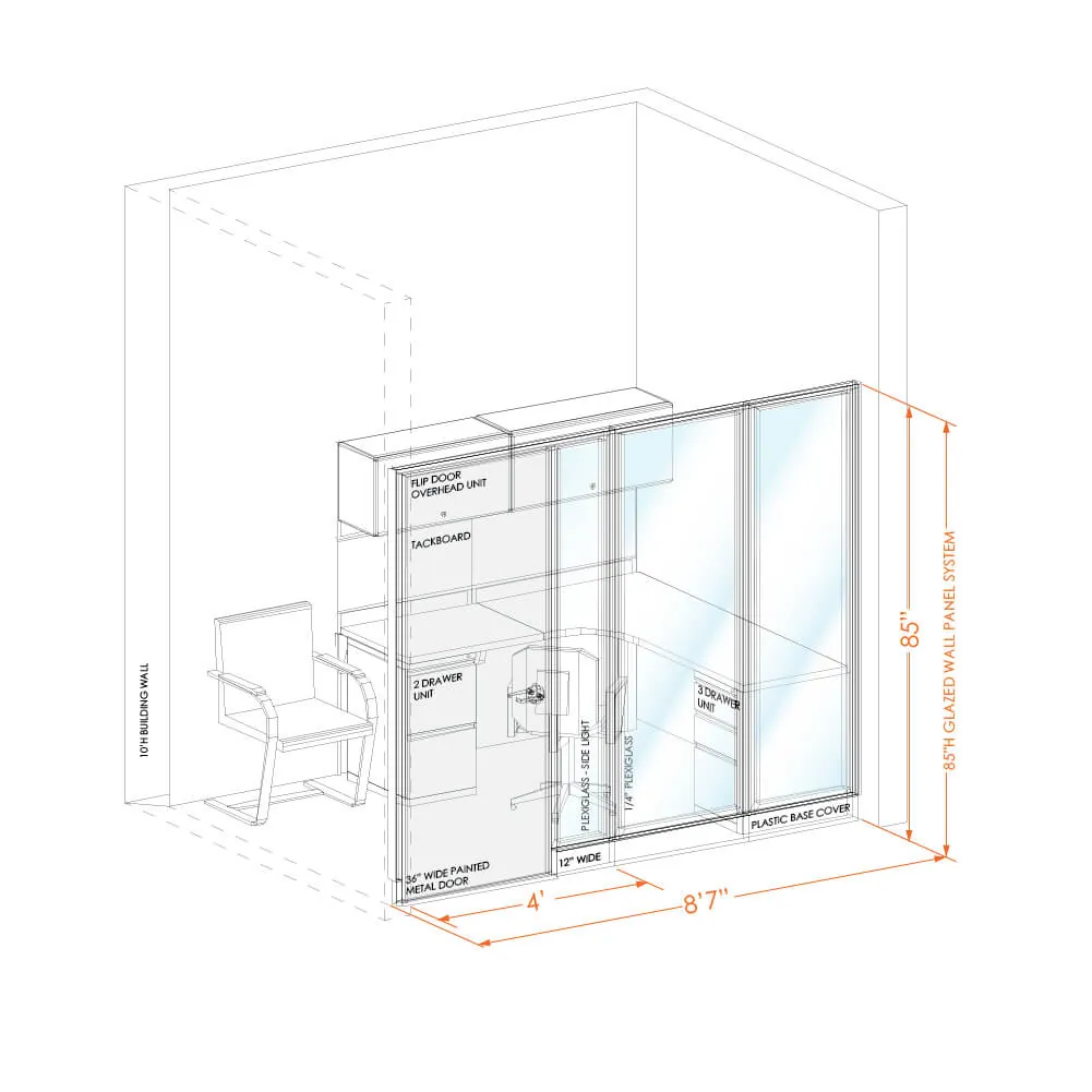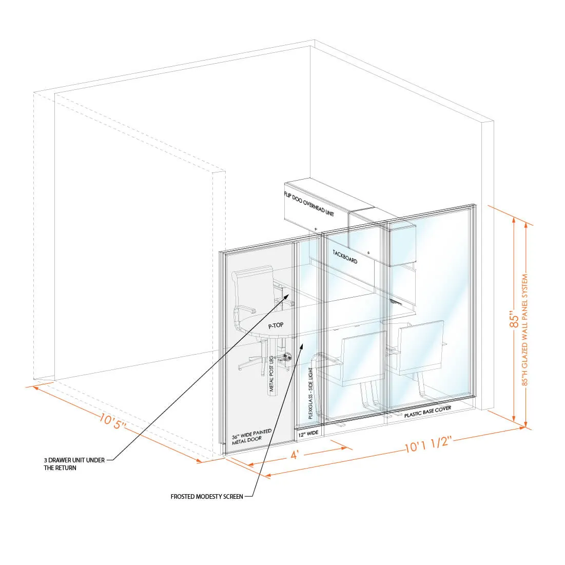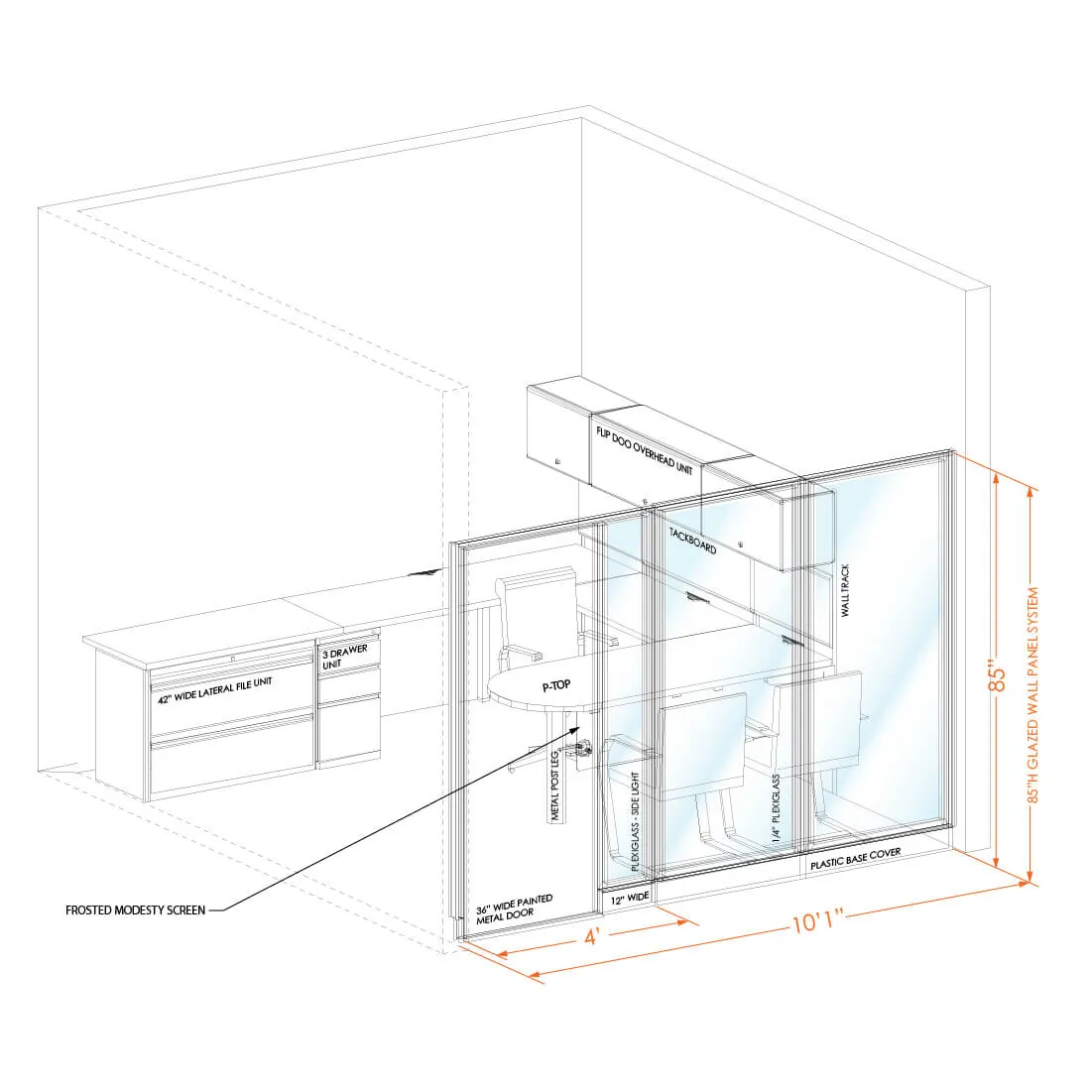 This Modular Office System consists of an I-shaped modular office partition wall with door, integrated system furniture and seating.