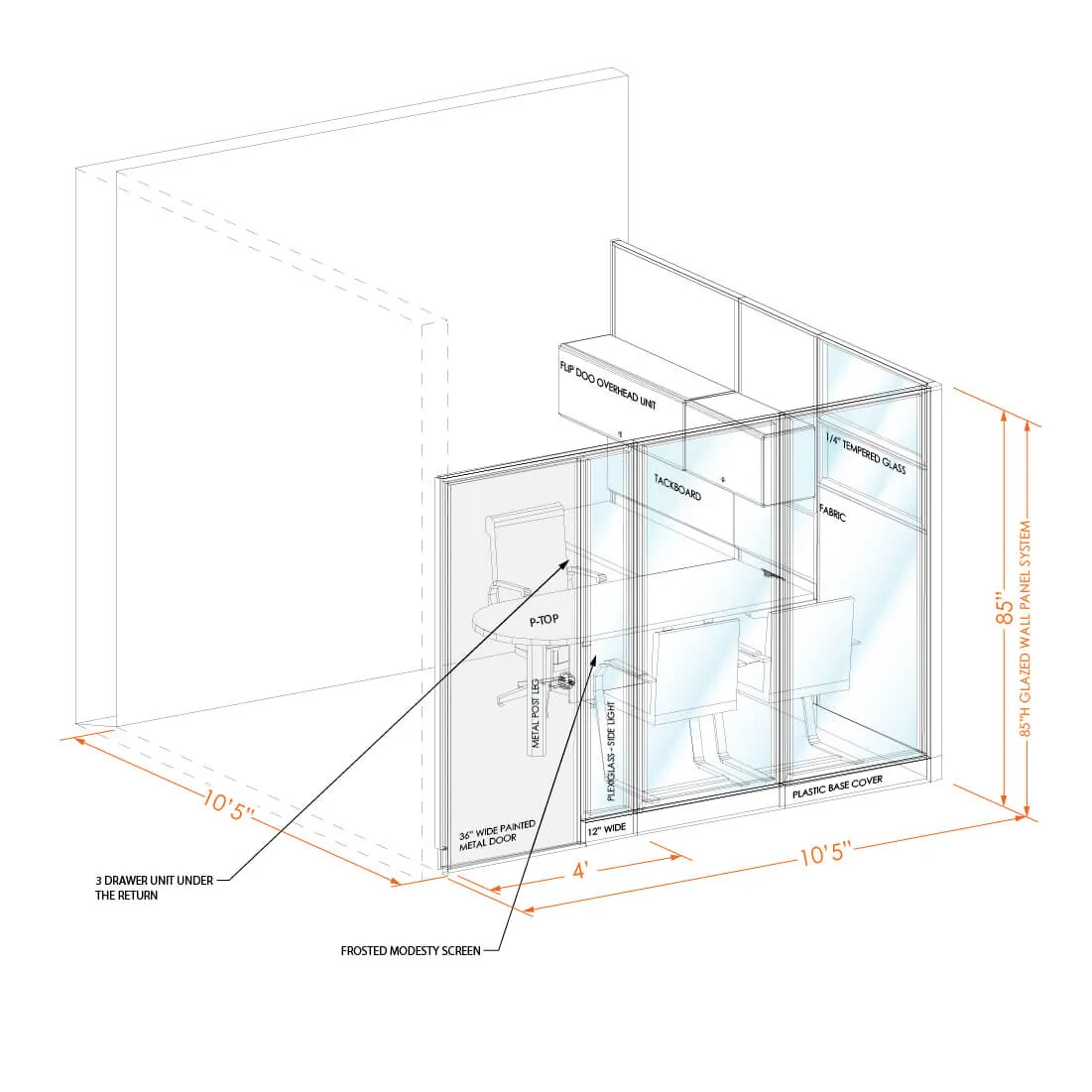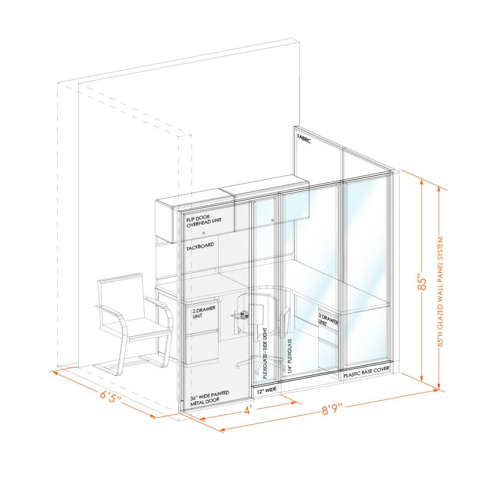 System furniture accompanies the walls to give you fully functional office in one go. Small L-shape or large U-shape desk (depending on the size of the office) comes with drawer units, overhead storage and tackboards. Hardware for attaching furniture to the panel wall is included, as well as wall tracks for mounting worksurfaces, overheads and tackboards on architectural walls when needed. Peninsula worksurfaces are provided in 10’x10’ and 10’x11’6” size offices.