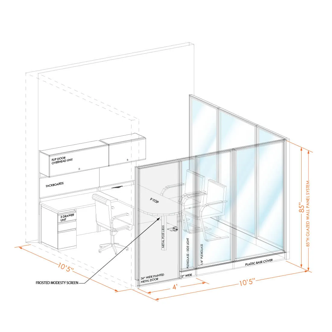 Laminate worksurfaces are supported by metal cantilevers and corner brackets that go into rail slots on panels or wall tracks. Metal drawer units come standard with full pull and one lock for all drawers on the same unit. Overhead units come with rounded edges and painted door with lock. Office configurations that have a peninsula front worksurfaces, include a metal post leg, as well as undermount frosted modesty screen attached with metal holders.