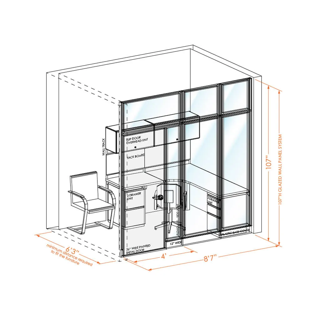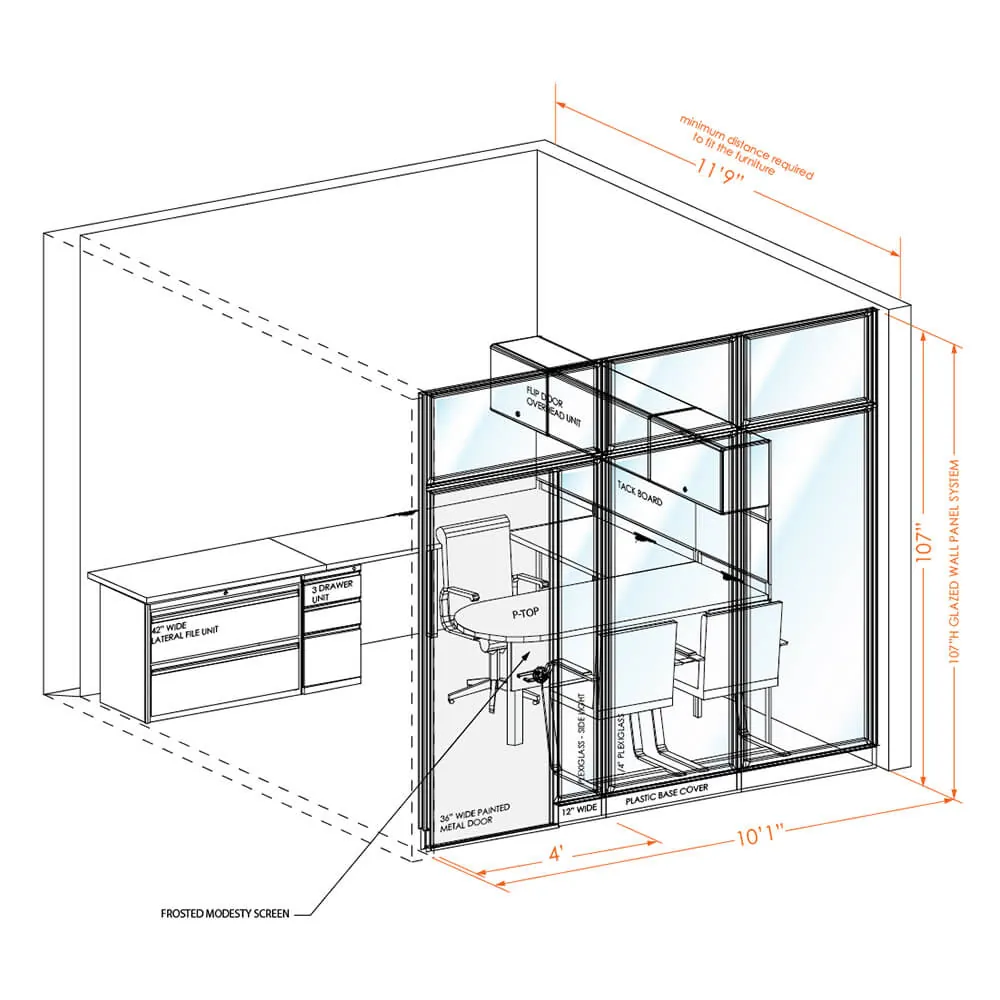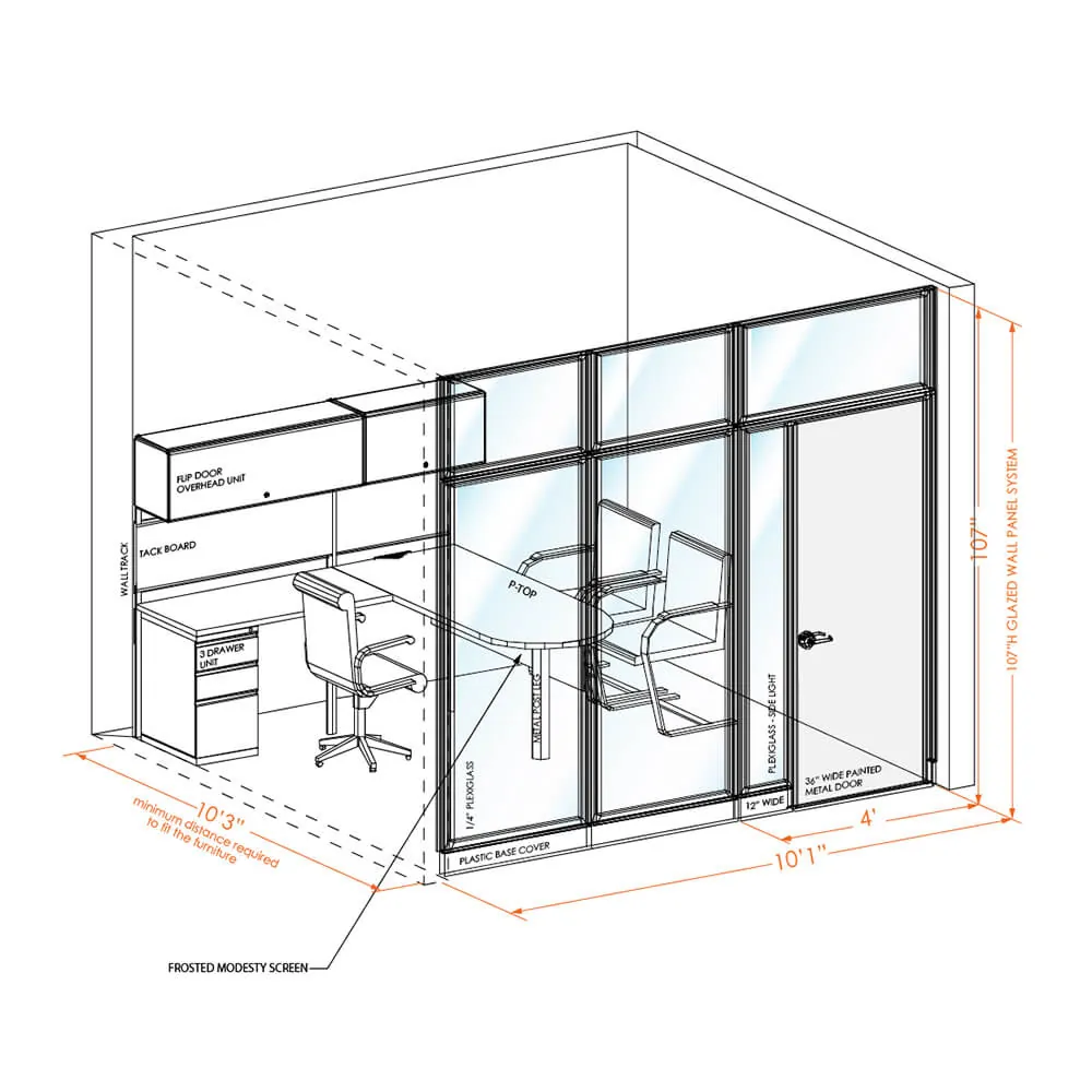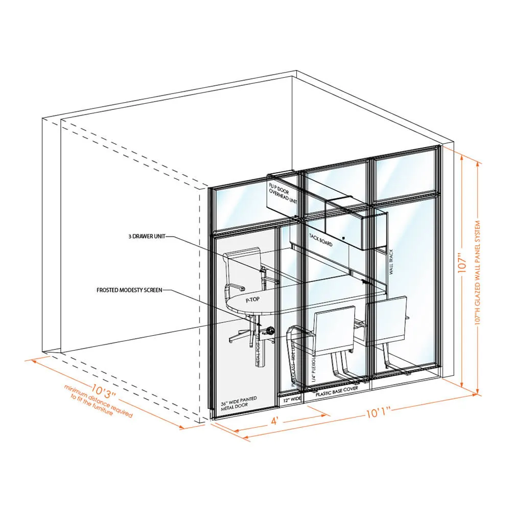 This Modular Office System consists of an I-shaped modular office partition wall with door, integrated system furniture and seating.