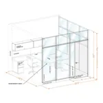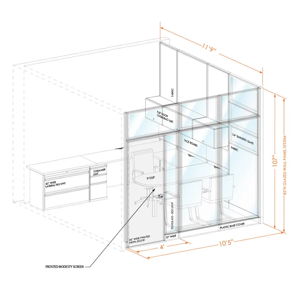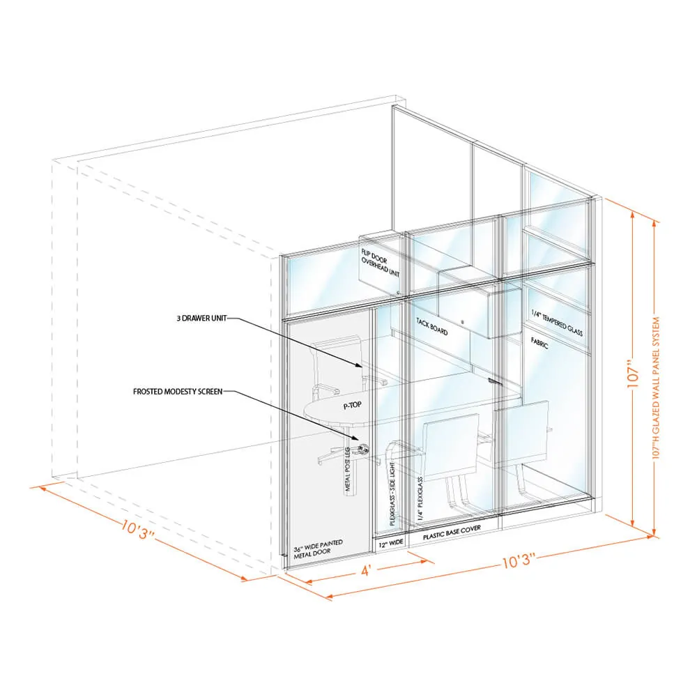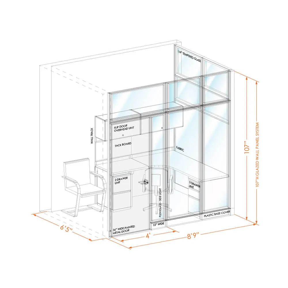System furniture accompanies the walls to give you fully functional office in one go. Small L-shape or large U-shape desk (depending on the size of the office) comes with drawer units, overhead storage and tackboards. Hardware for attaching furniture to the panel wall is included, as well as wall tracks for mounting worksurfaces, overheads and tackboards on architectural walls when needed. Peninsula worksurfaces are provided in 10’x10’ and 10’x11’6” size offices.