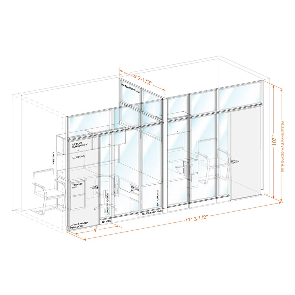 System furniture accompanies the walls to give you fully functional office in one go. Small L-shape or large U-shape desk (depending on the size of the office) comes with drawer units, overhead storage and tackboards. Hardware for attaching furniture to the panel wall is included, as well as wall tracks for mounting worksurfaces, overheads and tackboards on architectural walls when needed. Peninsula worksurfaces are provided in 10’x10’ and 10’x11’6” size offices.
