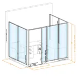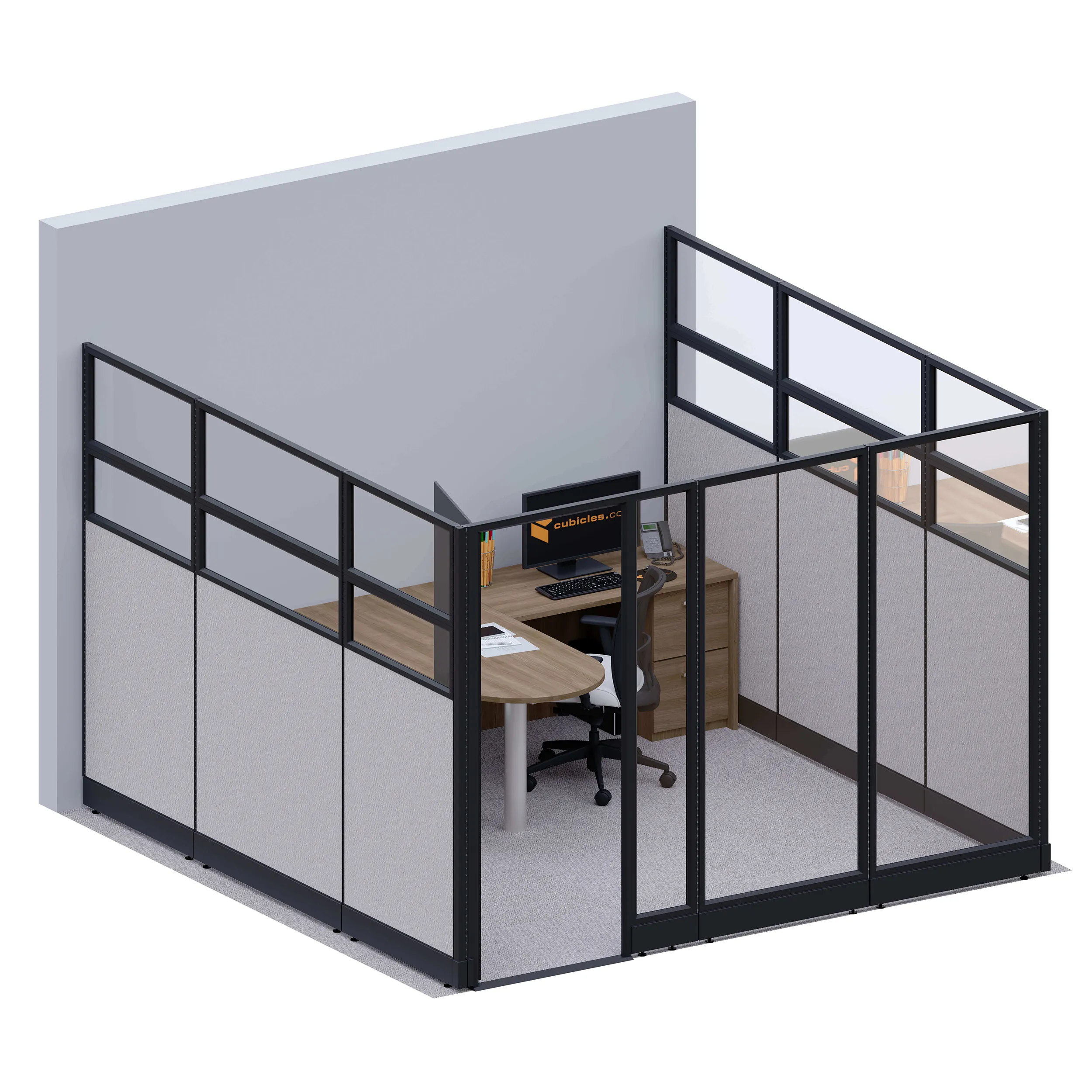 These modular wall panels for office spaces are arranged in a U-formation consisting of 3 movable office walls. Each of the side walls must be affixed to an existing architectural wall for stability and support.