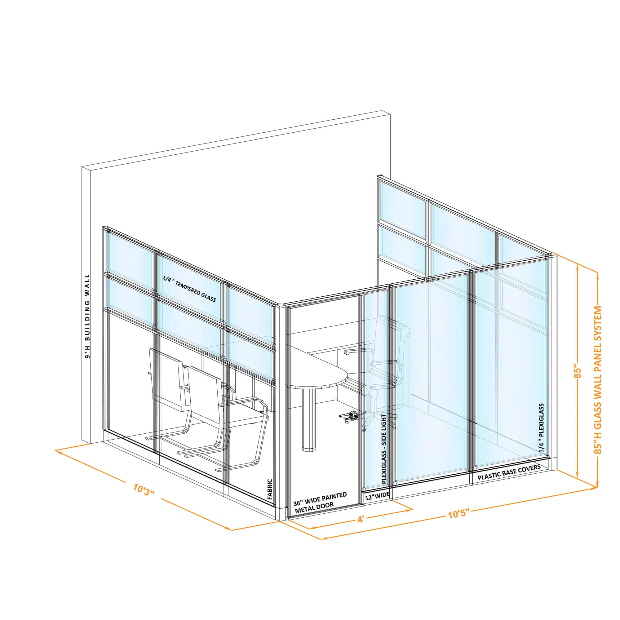 Estimated pricing is for non-powered, non-tackable office panels and metal office doors only, configured as pictured. Blue tinted areas on the 3D schematics indicate glass. Any desks, seating, or storage shown is sold separately.