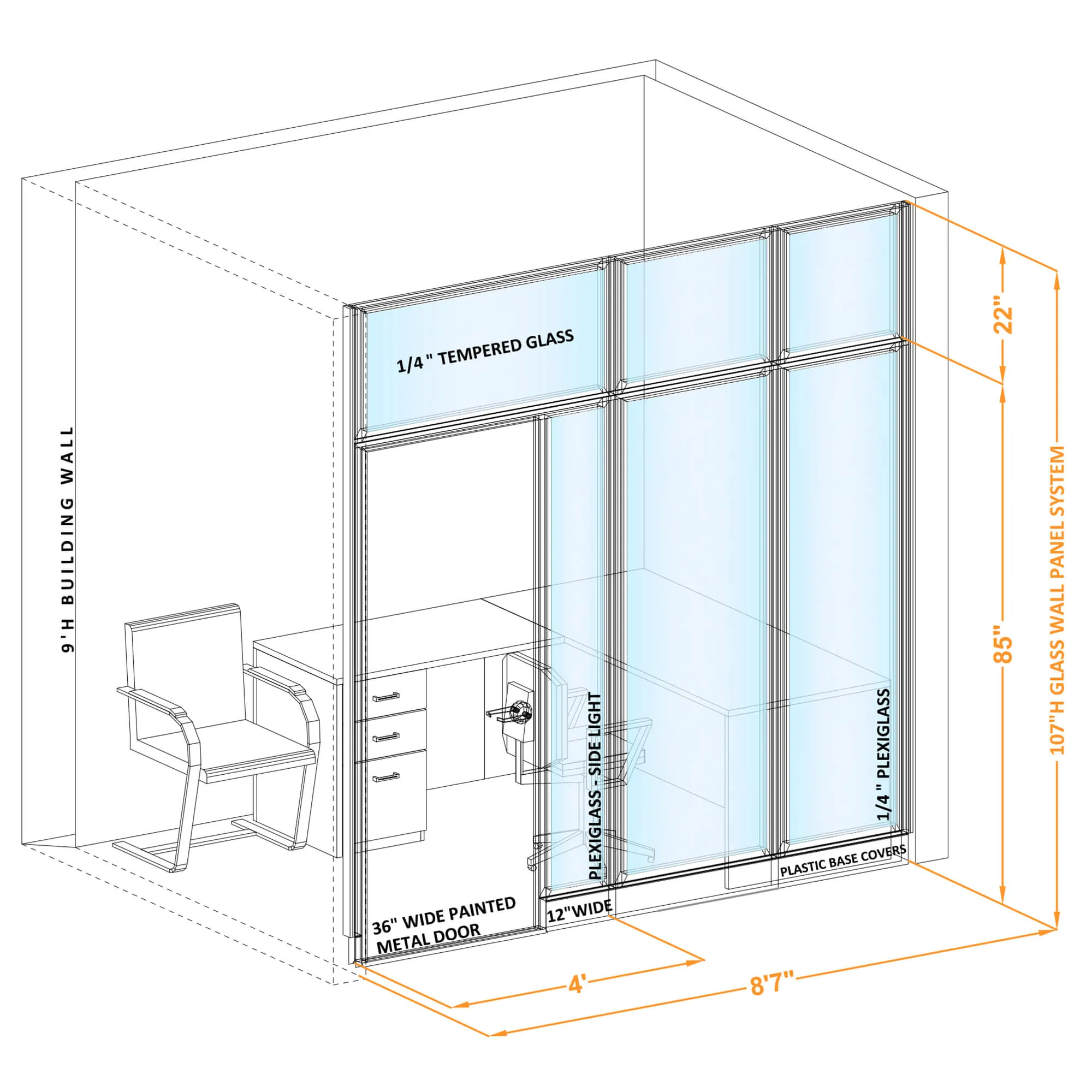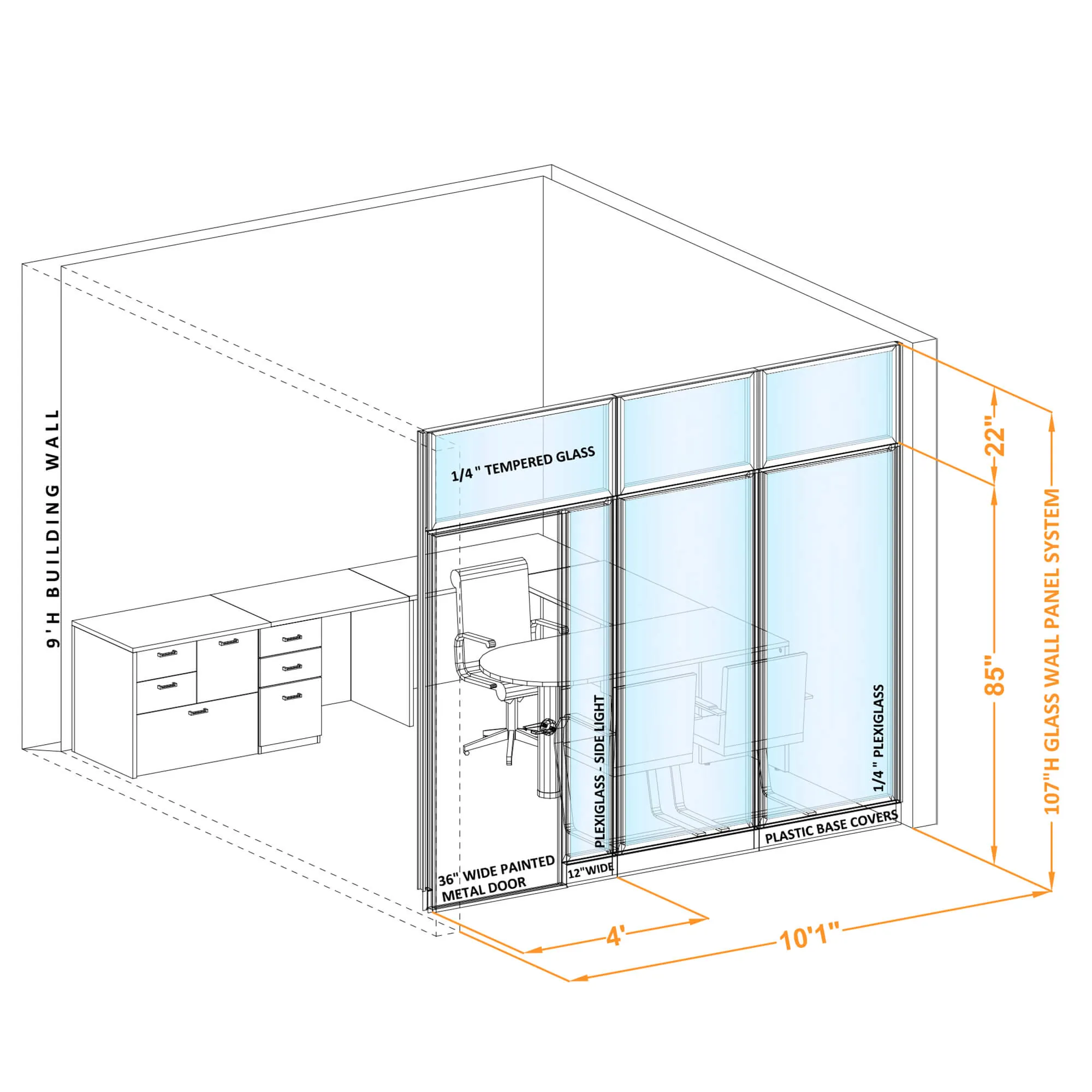 107”H interior dividing walls work great with 9ft ceilings for a nearly seamless floor-to-ceiling appearance, or for extra high ceilings where the extra footage can absorb some of the sound waves overhead. Want lower? Go Series 7!
