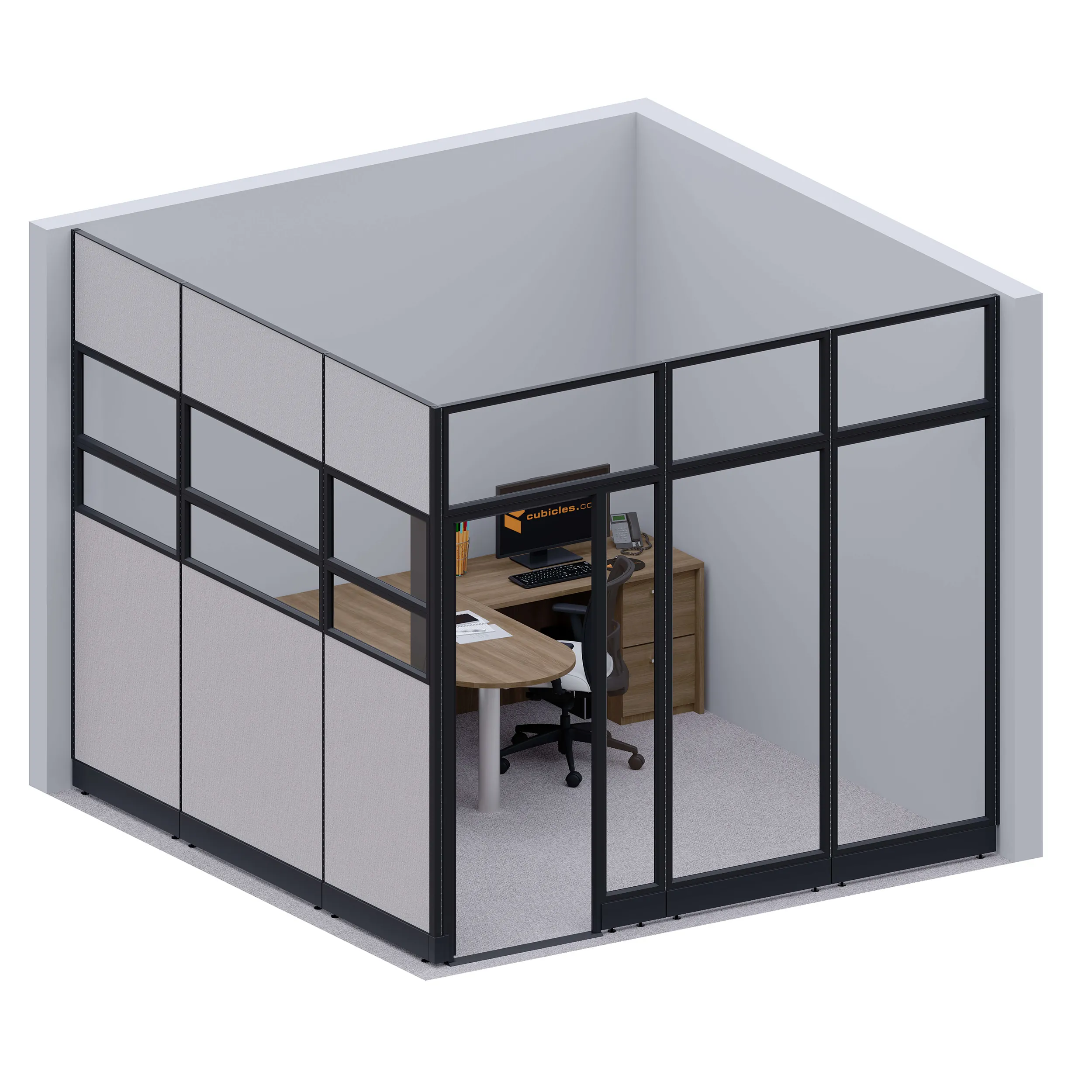 These modular office walls have precision engineered powder coated steel frames in black, white, or silver, and a painted-to-match metal office door with glass sidelight. The office door lock system is a lever lock set with keyed entry on the outside, and a thumbturn lock on the inside.