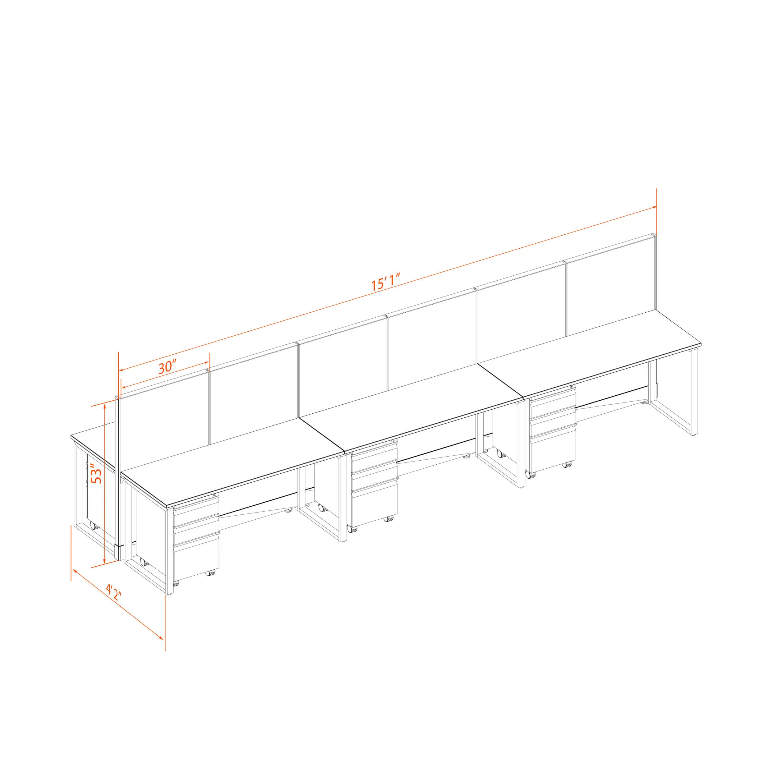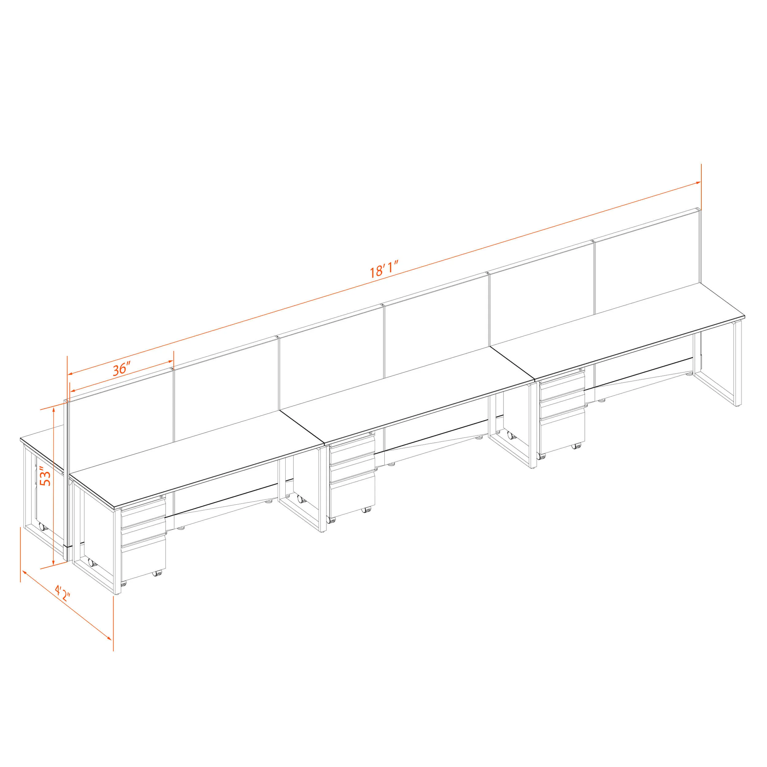 This layout includes 6 stations in a mirrored arrangement (facing each other), defined by 53”H walls that provide moderate boundaries, structural support, and channels for network/data cables (plus electricity, if you buy the powered model). Desk widths can be 60” or 72”.