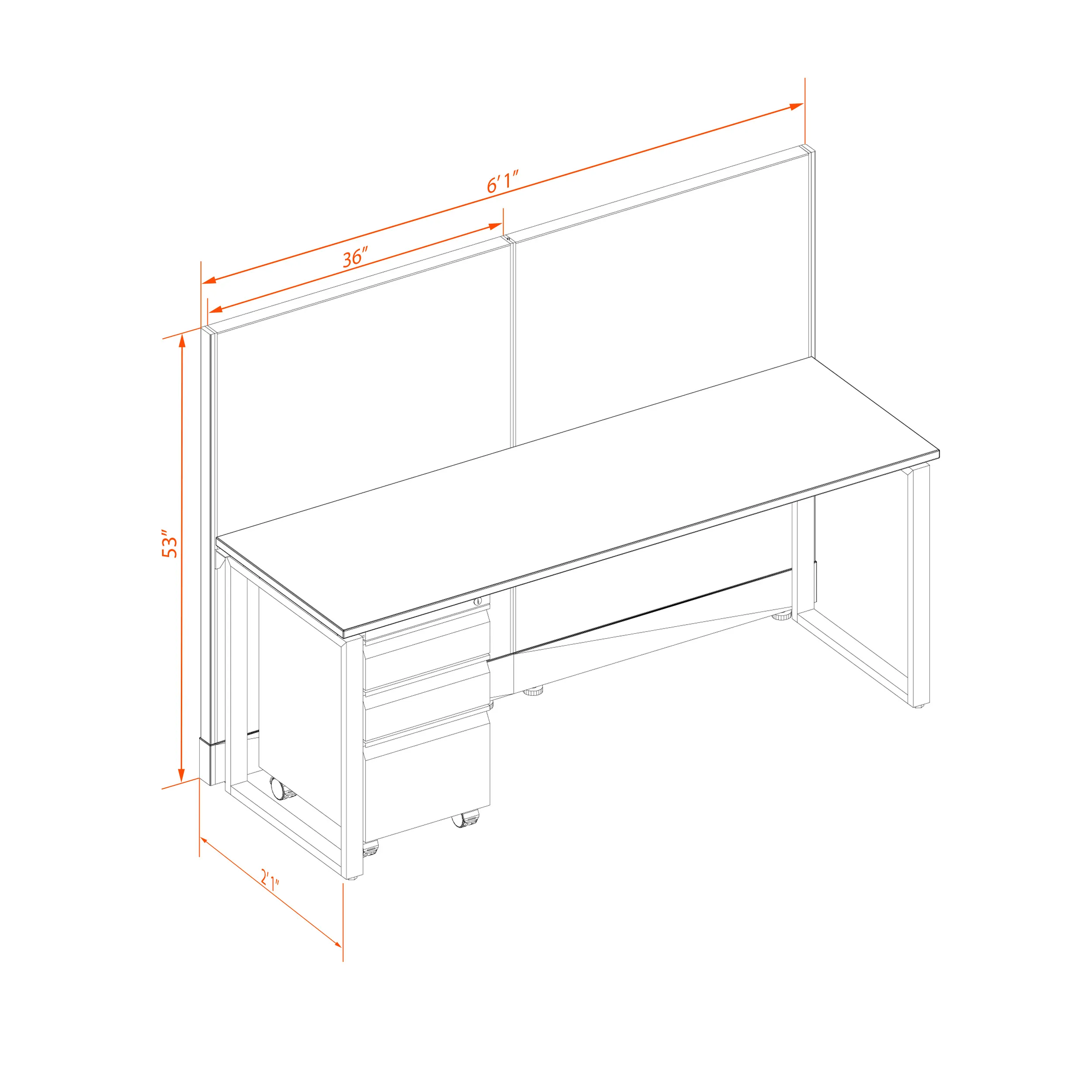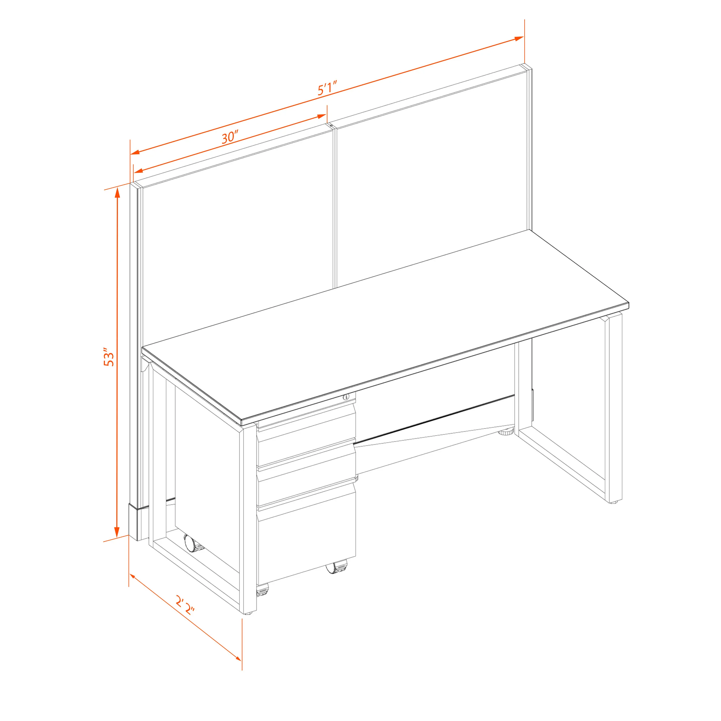 This configuration includes 1 station in a single arrangement, defined by 53”H cubicle walls that provide a moderate boundary, structural support, and channels for network/data cables (plus electricity, if you buy the powered model). Desk widths can be 60” or 72”.