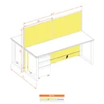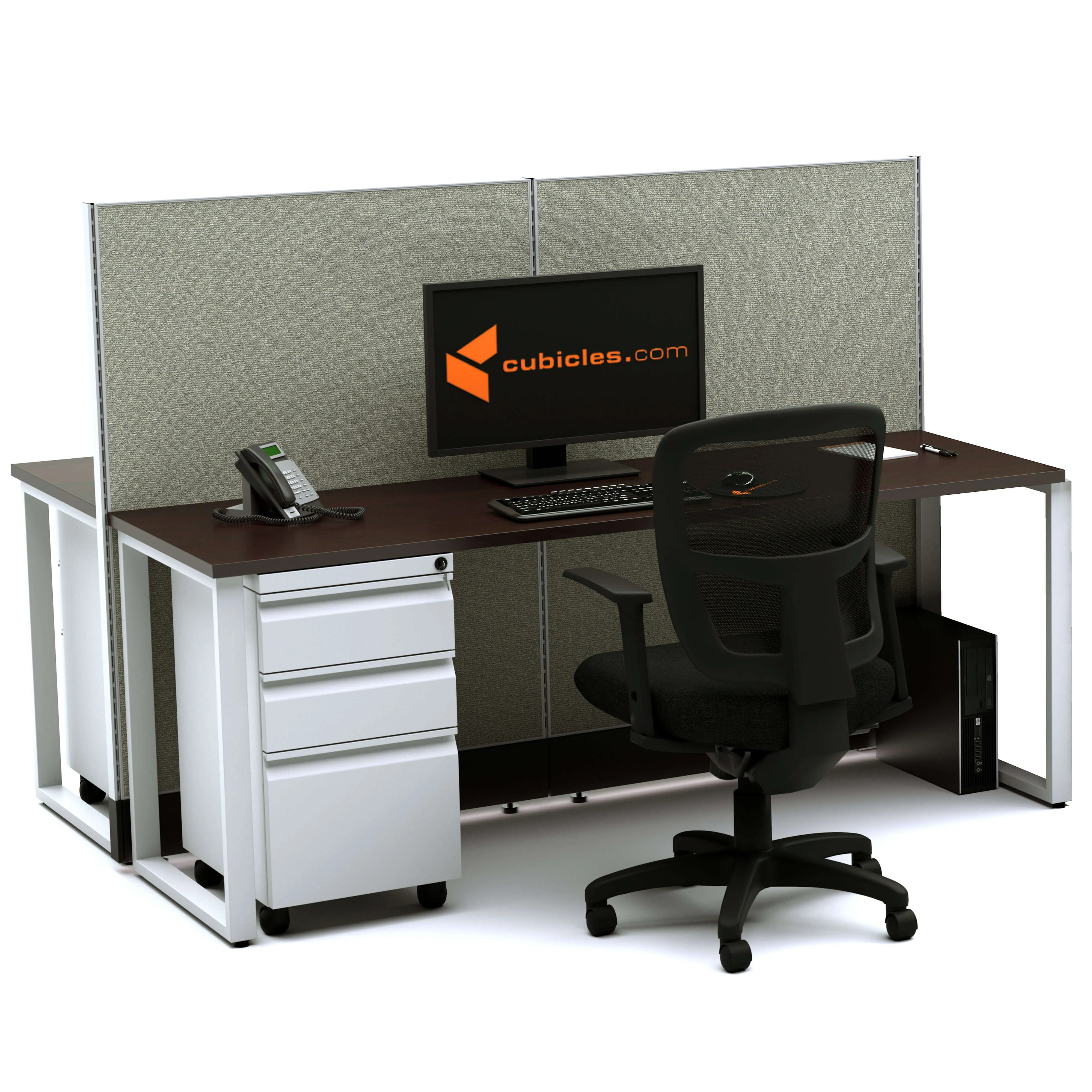This layout includes 2 stations in a mirrored arrangement (facing each other), defined by 53”H cubicle walls that provide a moderate boundary, structural support, and channels for network/data cables (plus electricity, if you buy the powered model). Desk widths can be 60” or 72”.