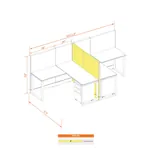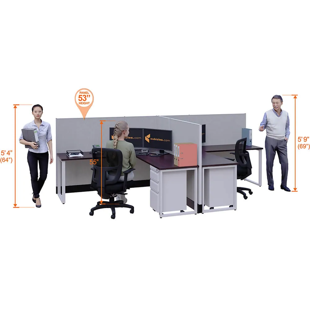 This layout includes 2 stations in a mirrored arrangement (facing each other), defined by 53”H walls that provide moderate boundaries, structural support, and channels for network/data cables (plus electricity, if you buy the powered model). Desk widths can be 60” or 72”.