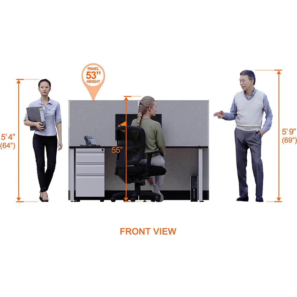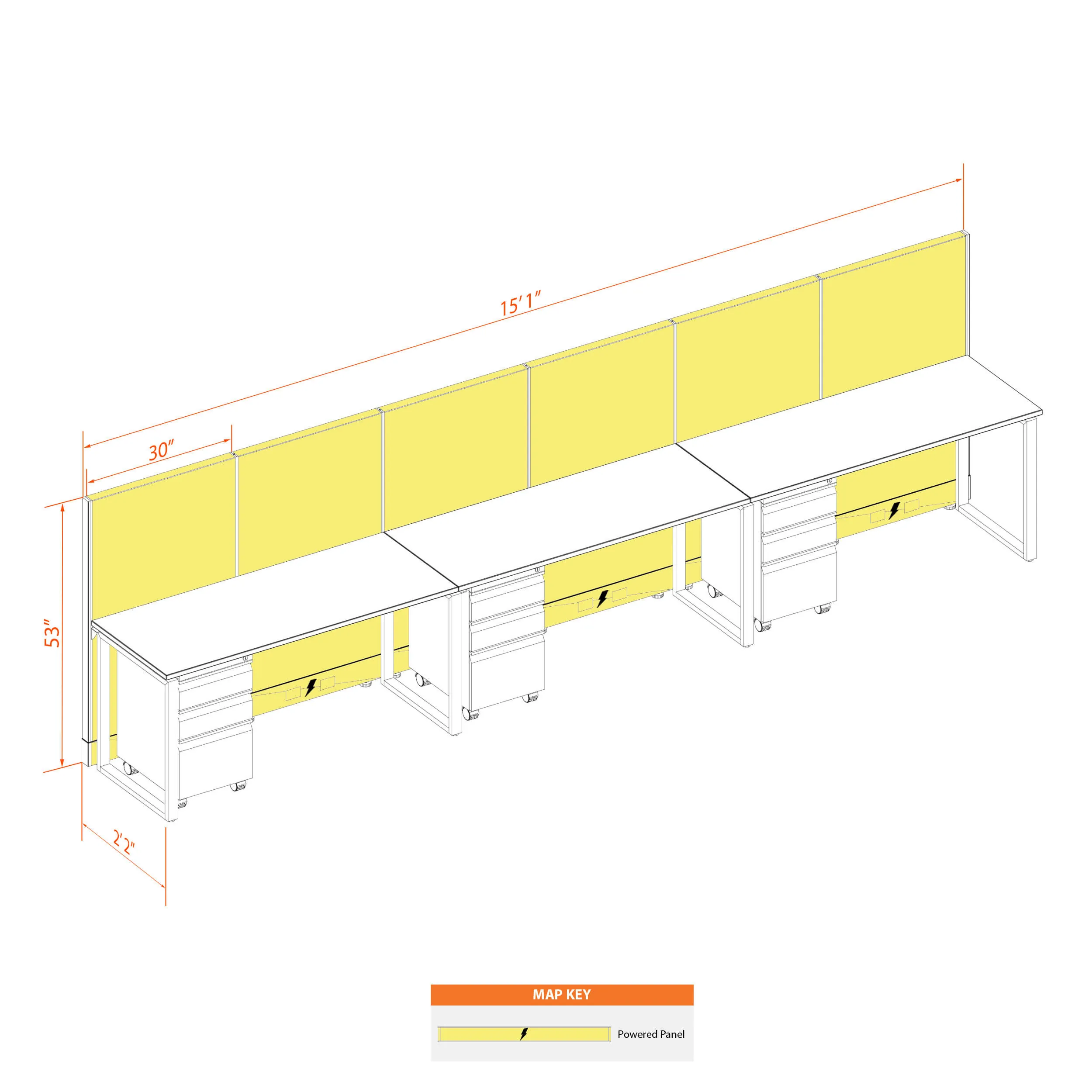 This layout includes 3 stations in an inline arrangement (one row all facing the same way), defined by 53”H cubicle walls that provide moderate boundaries, structural support, and channels for network/data cables (plus electricity, if you buy the powered model). Desk widths can be 60” or 72”.