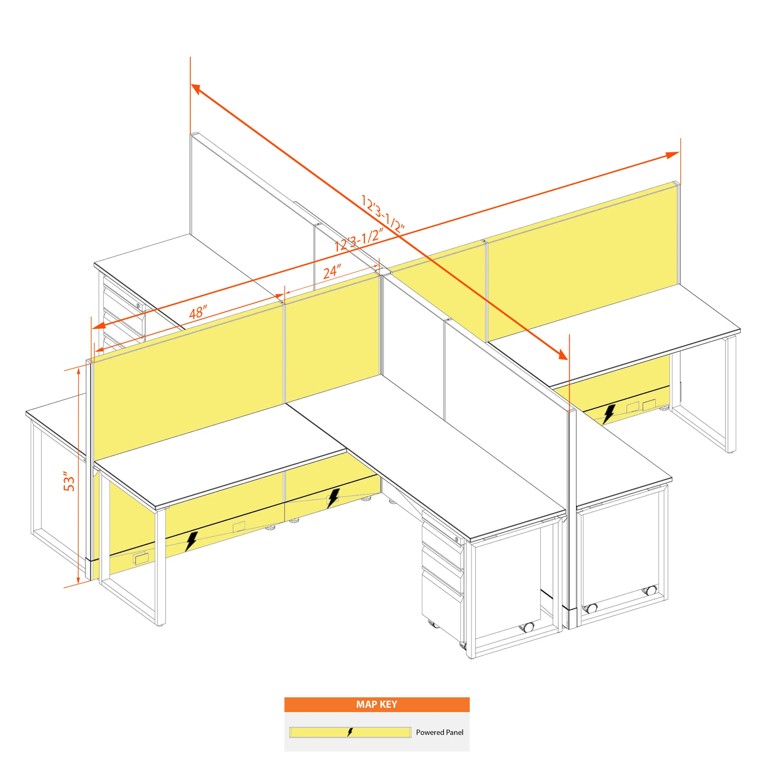 This layout includes 4 stations in a mirrored arrangement (facing each other), defined by 53”H walls that provide moderate boundaries, structural support, and channels for network/data cables (plus electricity, if you buy the powered model). Desk widths can be 60” or 72”.