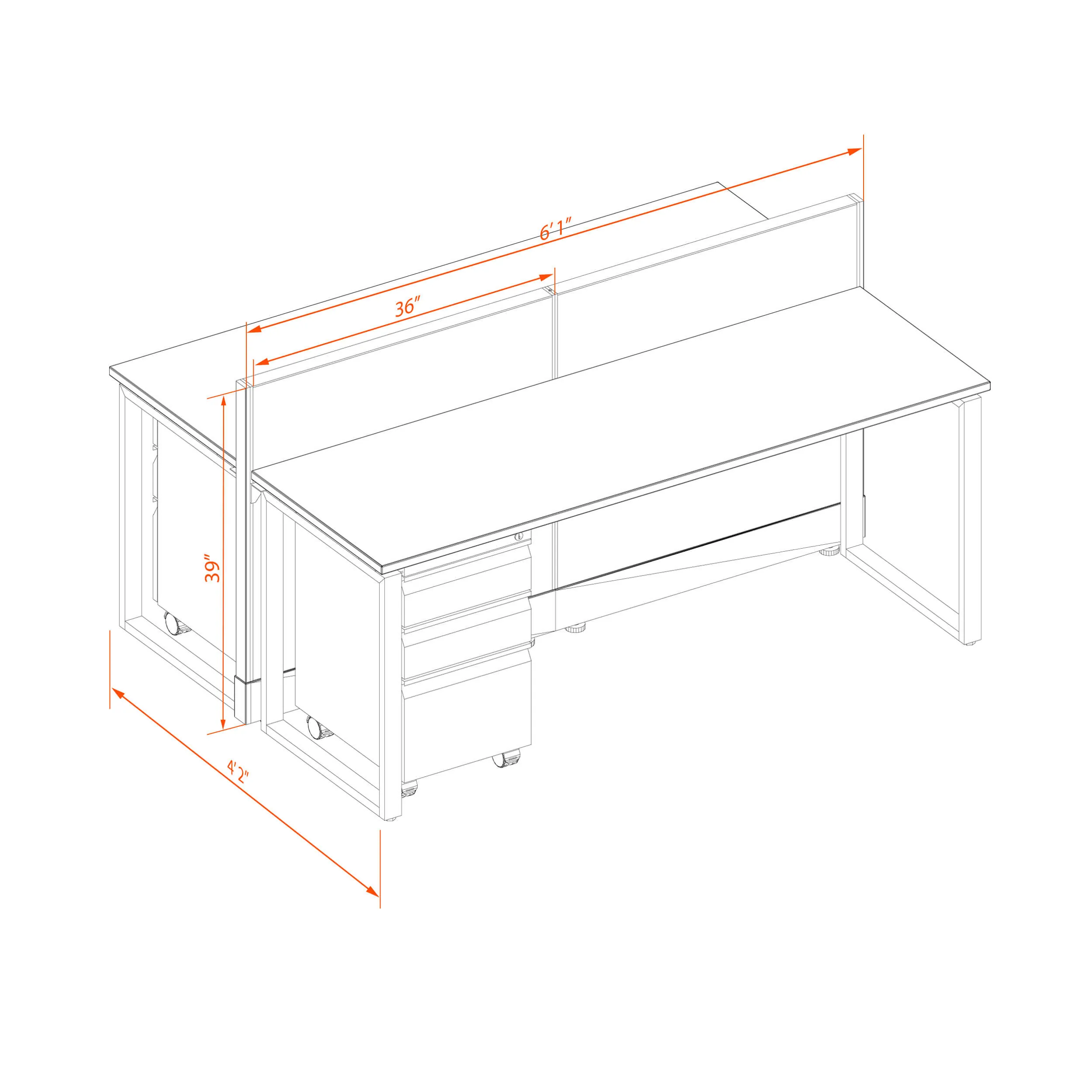 This layout includes 2 stations in a mirrored arrangement (facing each other), defined by 39”H walls that provide a subtle boundary, structural support, and channels for network/data cables (plus electricity, if you buy the powered model). Desk widths can be 60” or 72”.