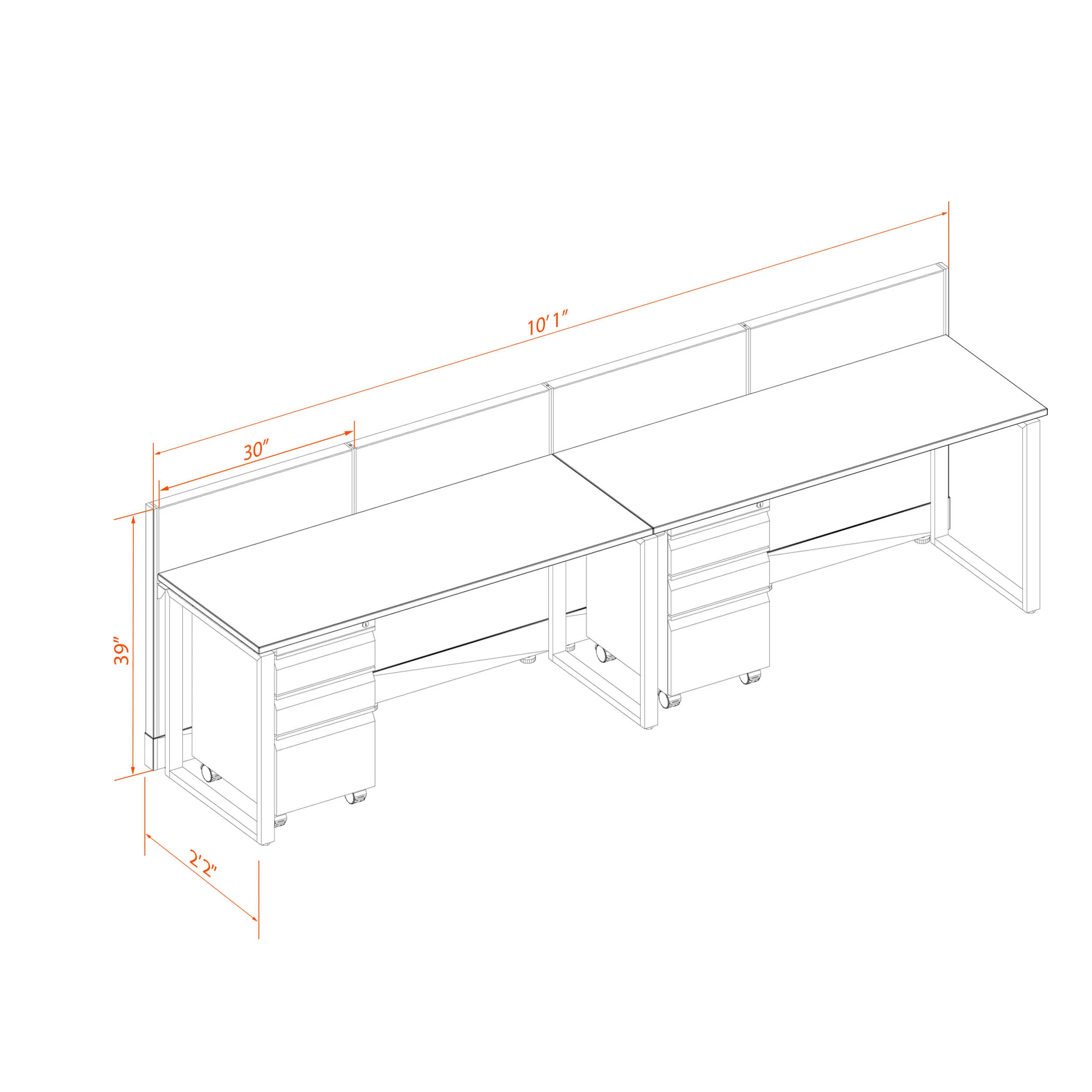 This configuration includes 2 stations in an inline arrangement (one row all facing the same way), defined by 39”H cubicle walls that provide a subtle boundary, structural support, and channels for network/data cables (plus electricity, if you buy the powered model). Desk widths can be 60” or 72”.
