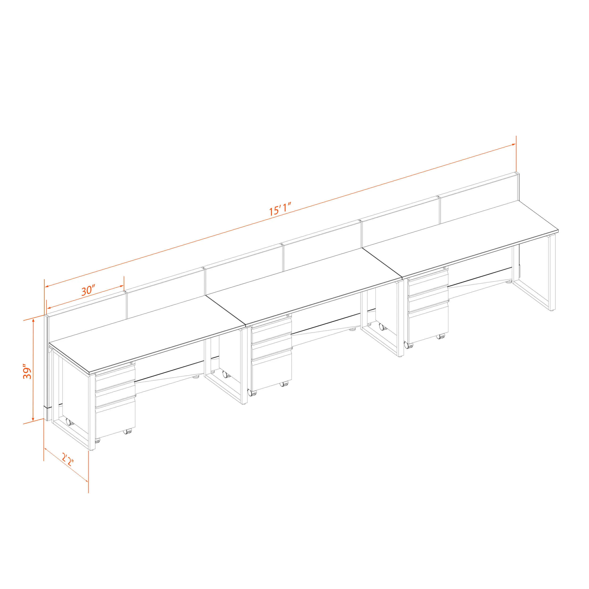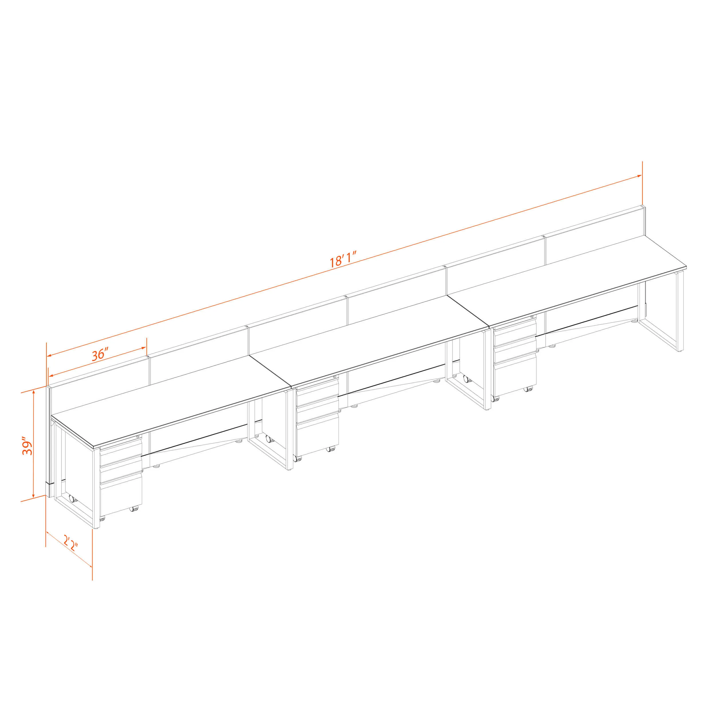 This configuration includes 3 stations in an inline arrangement (one row all facing the same way), defined by 39”H cubicle walls that provide subtle boundaries, structural support, and channels for network/data cables (plus electricity, if you buy the powered model). Desk widths can be 60” or 72”.