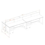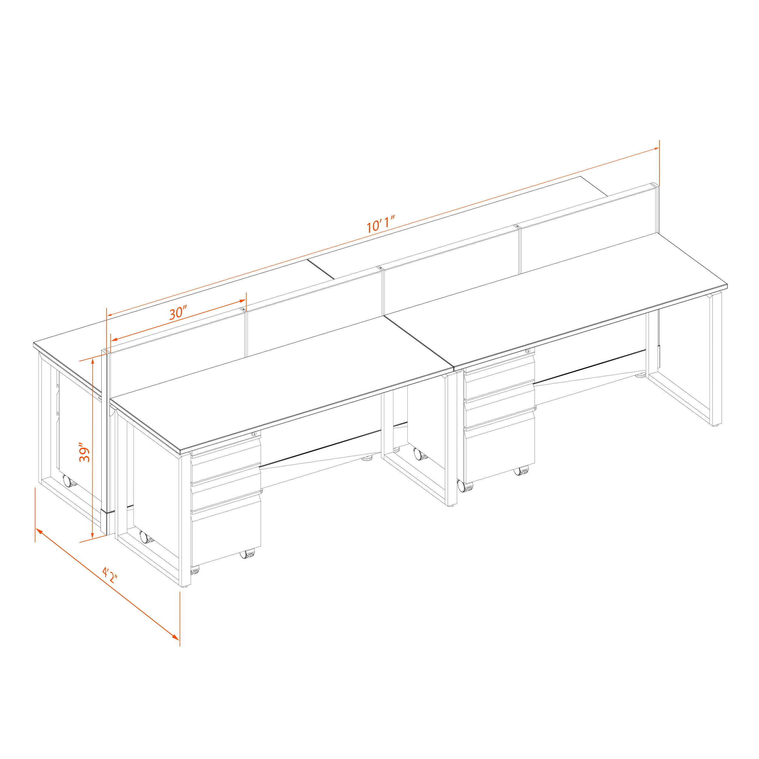 This layout includes 4 stations in a mirrored arrangement (facing each other), defined by 39”H walls that provide subtle boundaries, structural support, and channels for network/data cables (plus electricity, if you buy the powered model). Desk widths can be 60” or 72”.