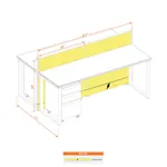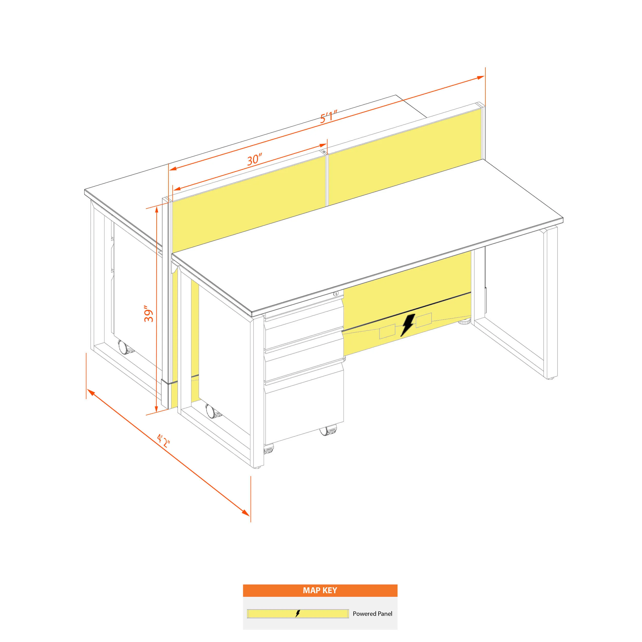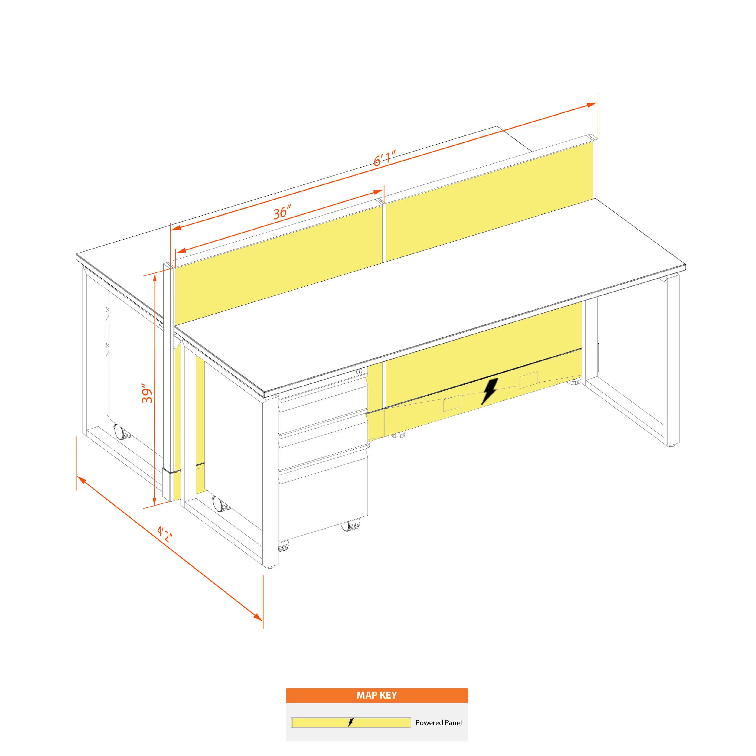 This layout includes 2 stations in a mirrored arrangement (facing each other), defined by 39”H walls that provide a subtle boundary, structural support, and channels for network/data cables (plus electricity, if you buy the powered model). Desk widths can be 60” or 72”.