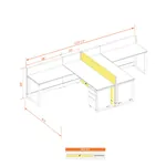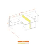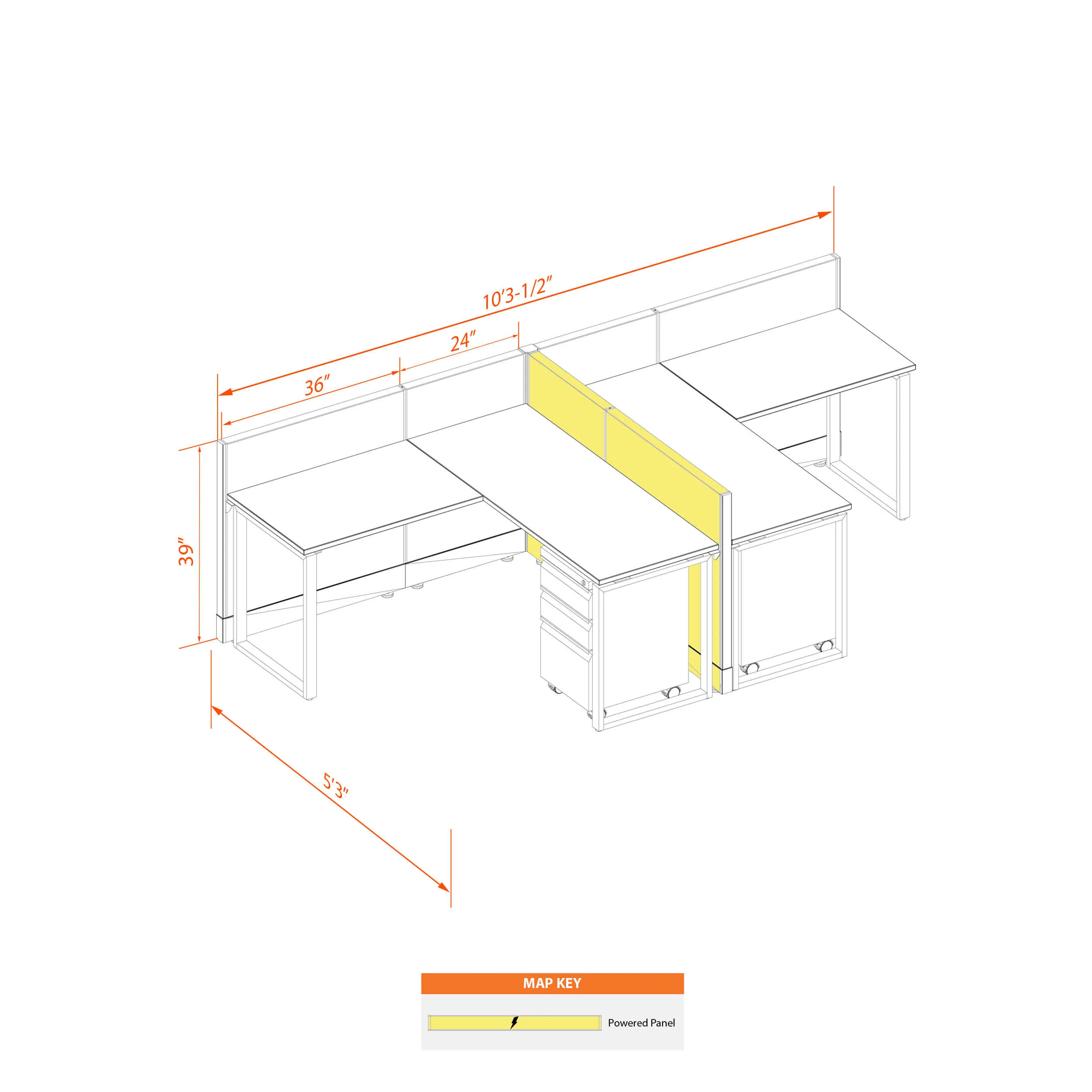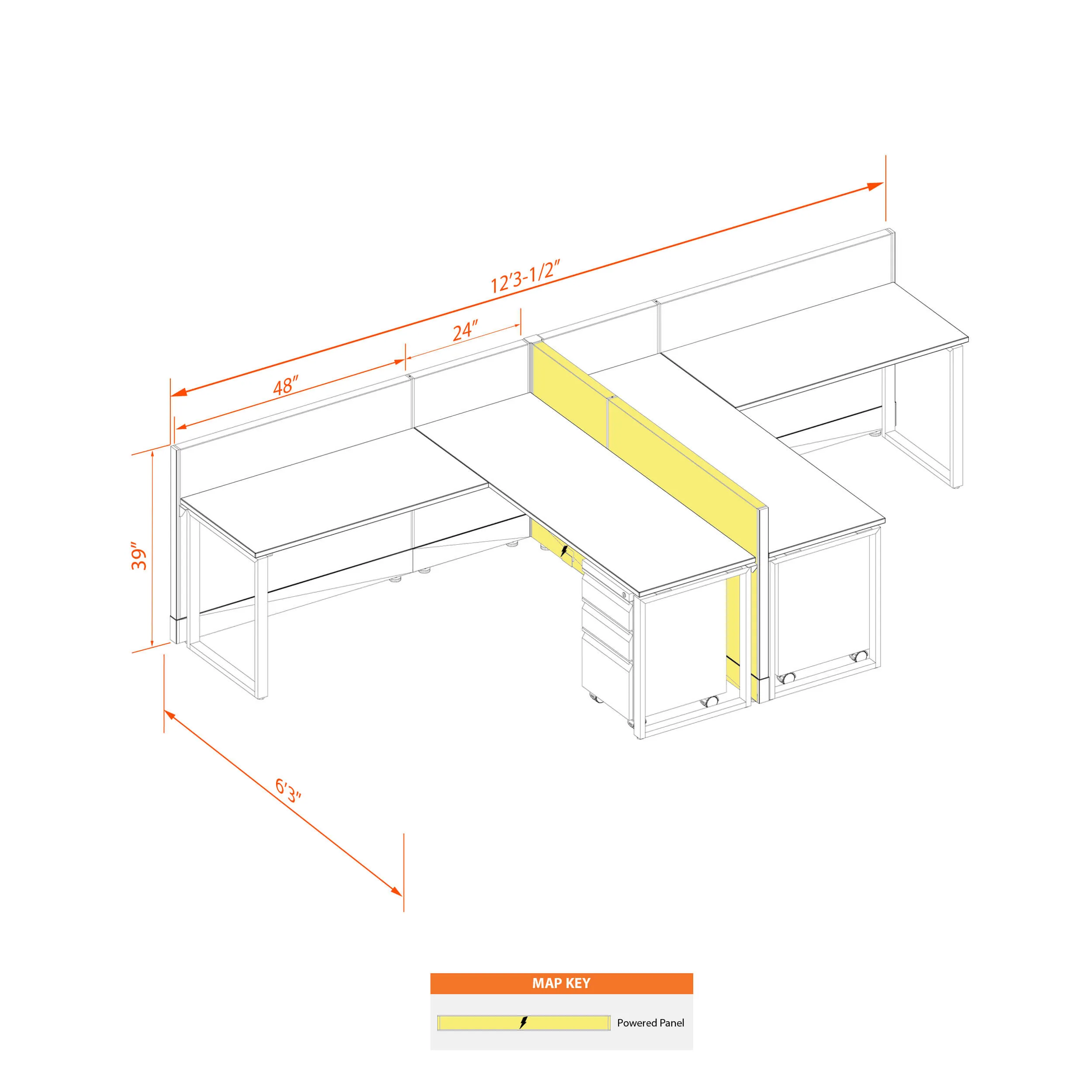 This layout includes 2 stations in a mirrored arrangement (facing each other), defined by 39”H walls that provide subtle boundaries, structural support, and channels for network/data cables (plus electricity, if you buy the powered model). Desk widths can be 60” or 72”.