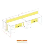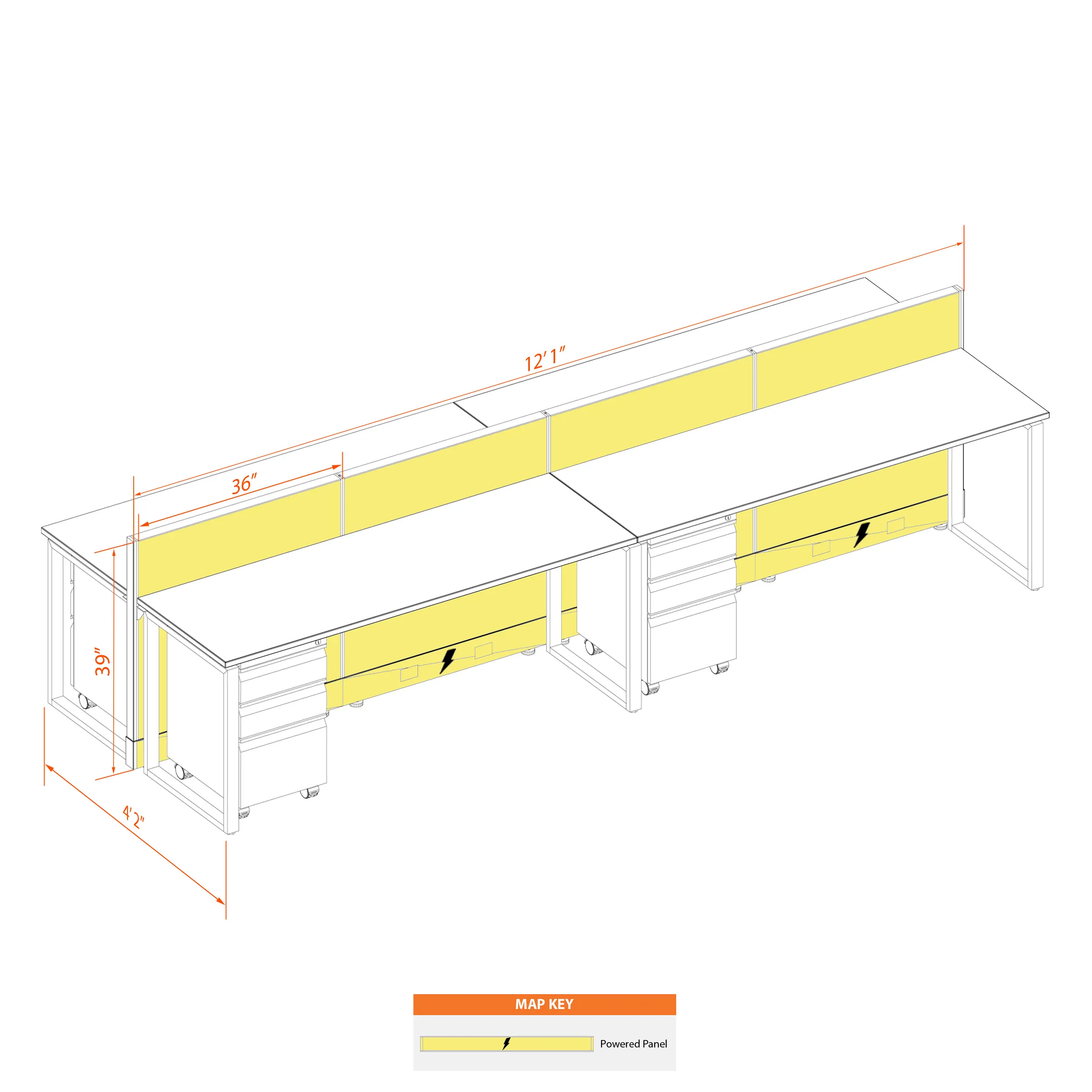 This layout includes 4 stations in a mirrored arrangement (facing each other), defined by 39”H walls that provide subtle boundaries, structural support, and channels for network/data cables (plus electricity, if you buy the powered model). Desk widths can be 60” or 72”.