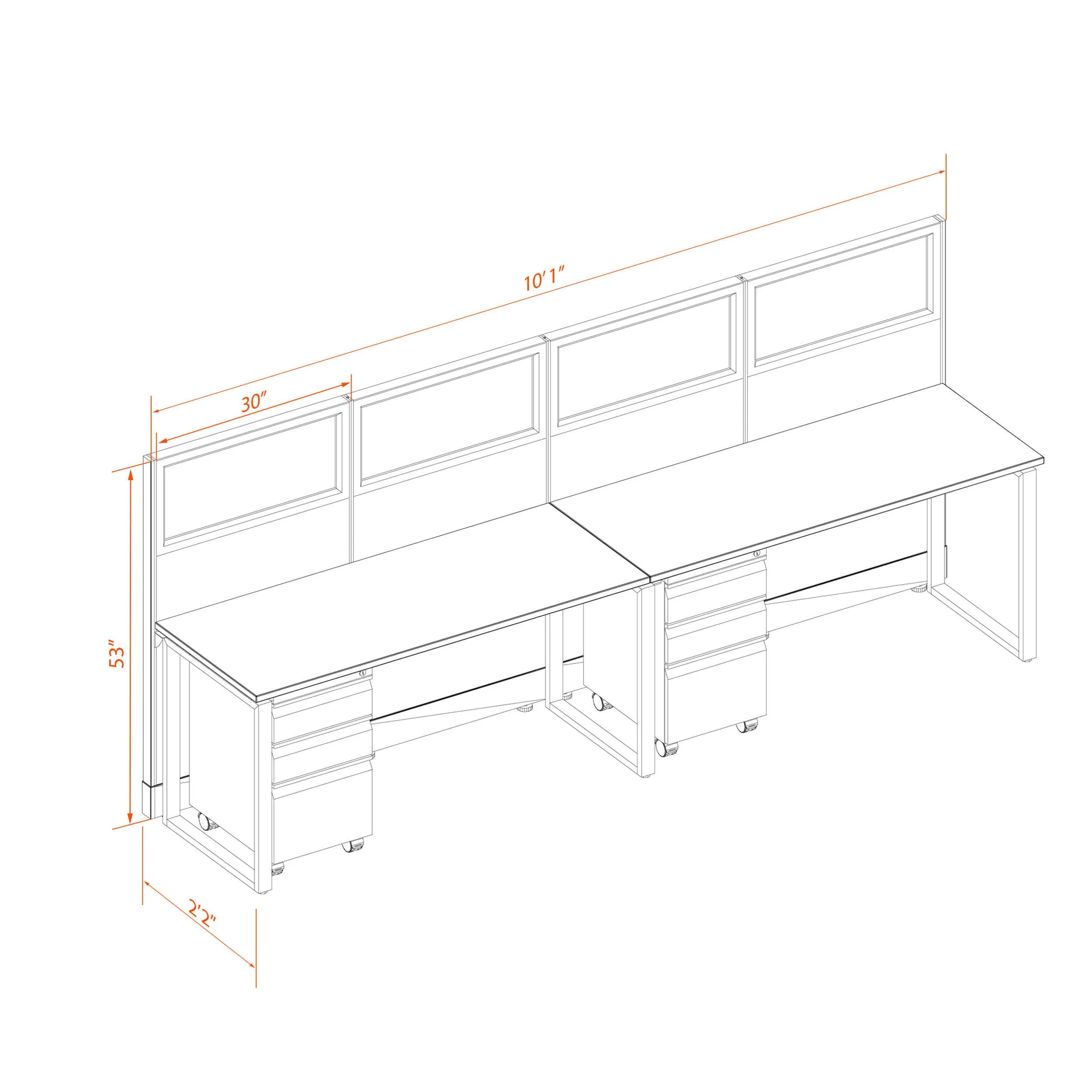 This configuration includes 2 stations in an inline arrangement (one row all facing the same way), defined by 53”H cubicle walls with windows that provide a moderate boundary, structural support, and channels for network/data cables (plus electricity, if you buy the powered model). Desk widths can be 60” or 72”.