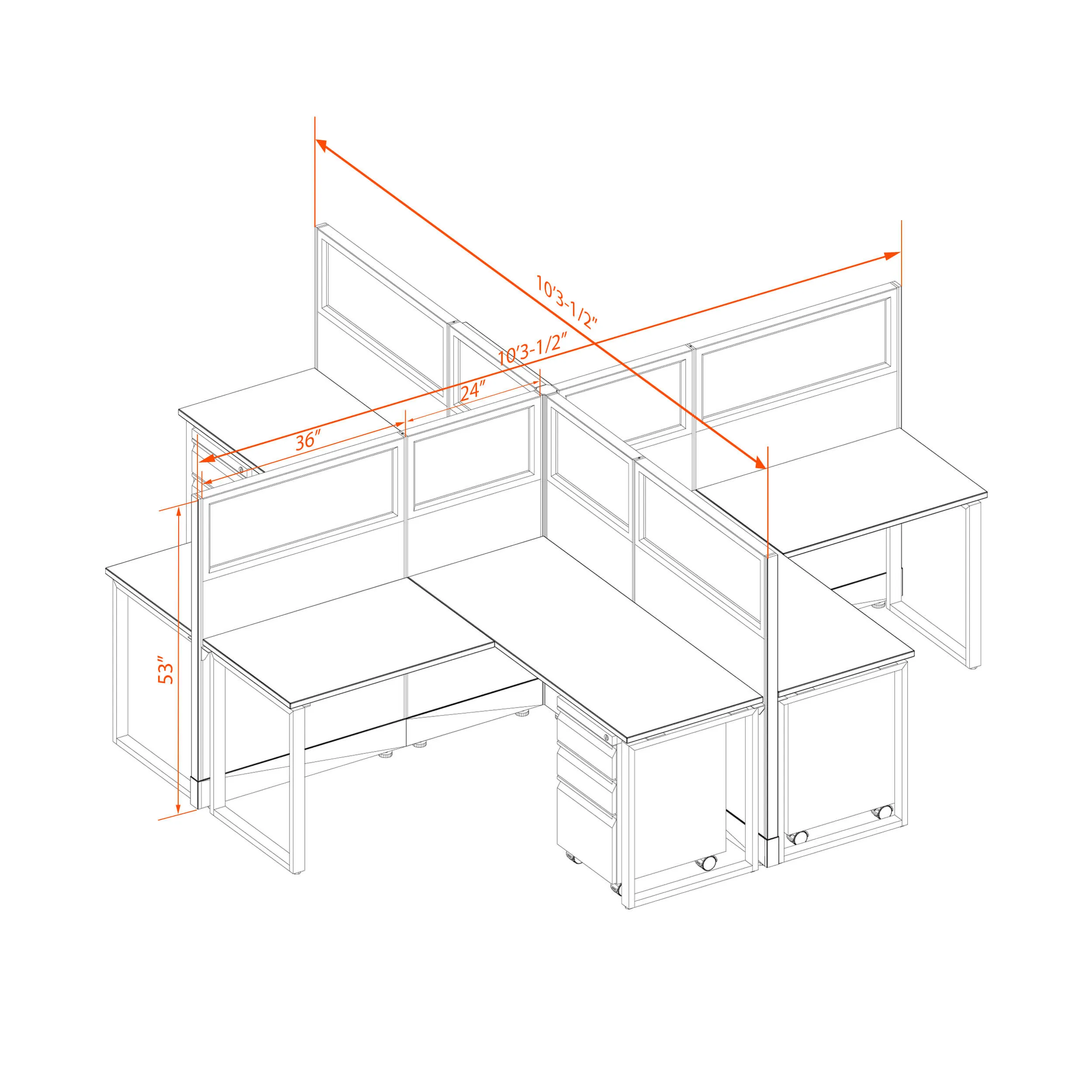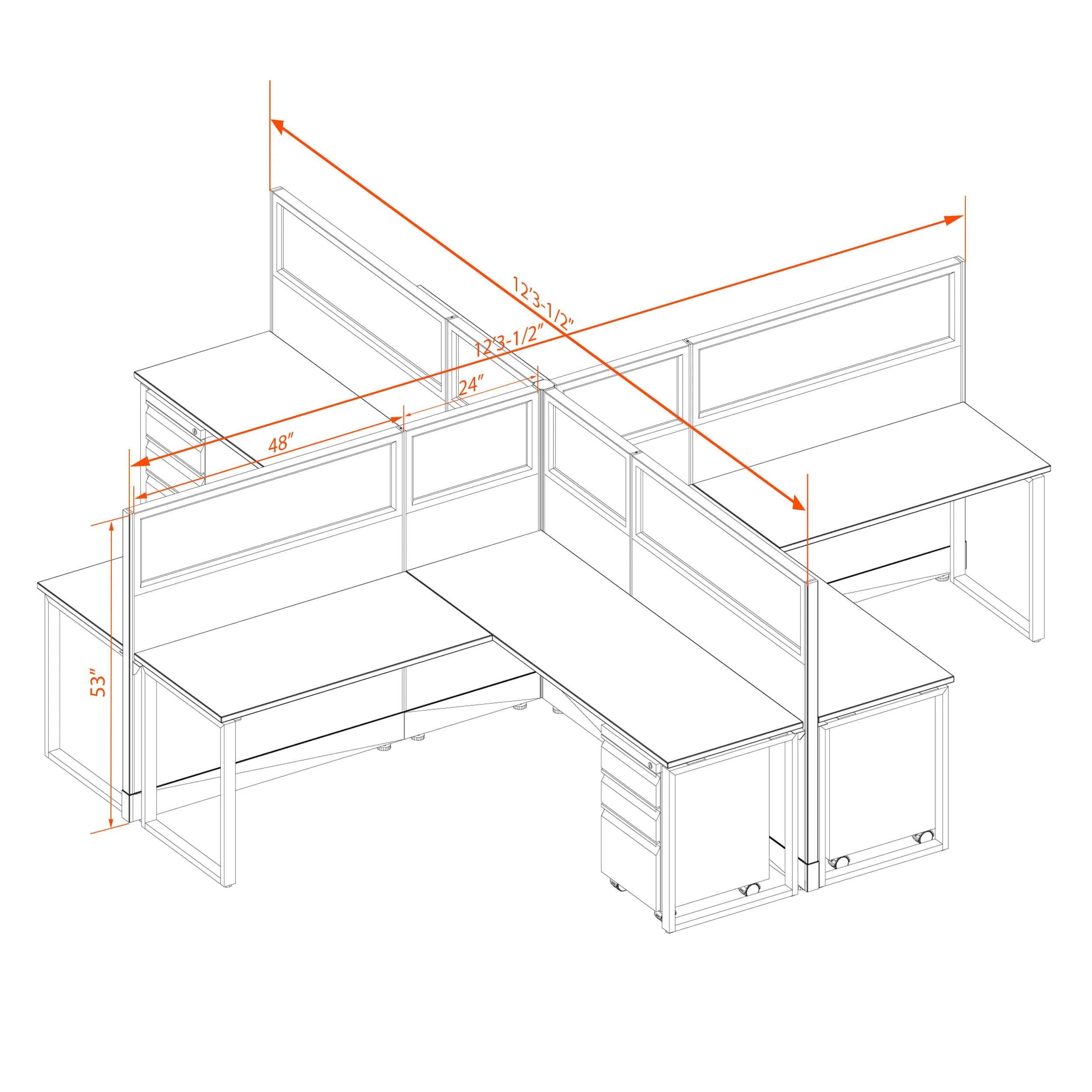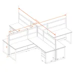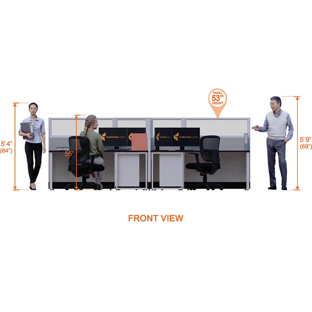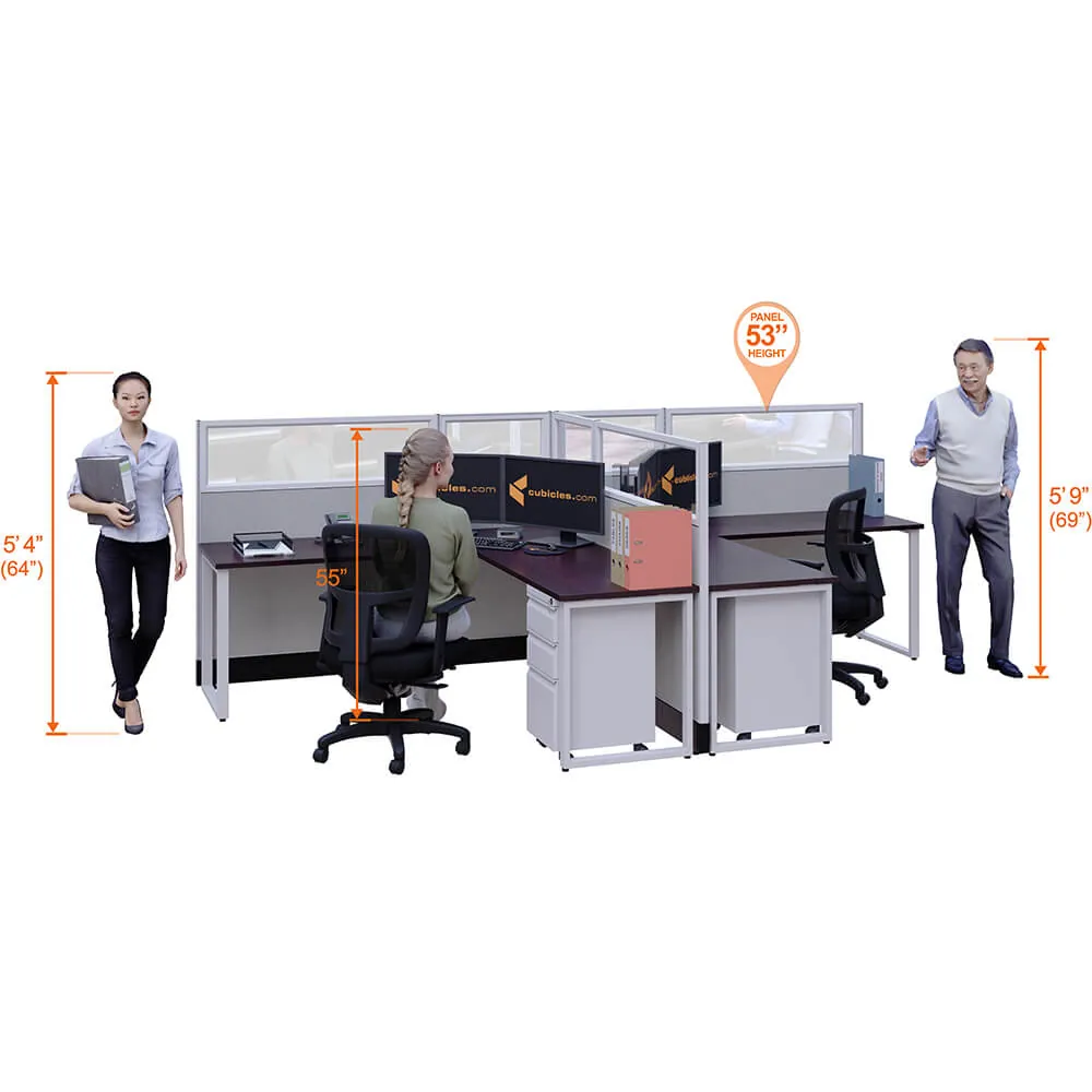 This configuration includes 4 stations in a mirrored arrangement (facing each other), defined by 53”H cubicle walls with windows that provide moderate boundaries, structural support, and channels for network/data cables (plus electricity, if you buy the powered model). Desk widths can be 60” or 72”.