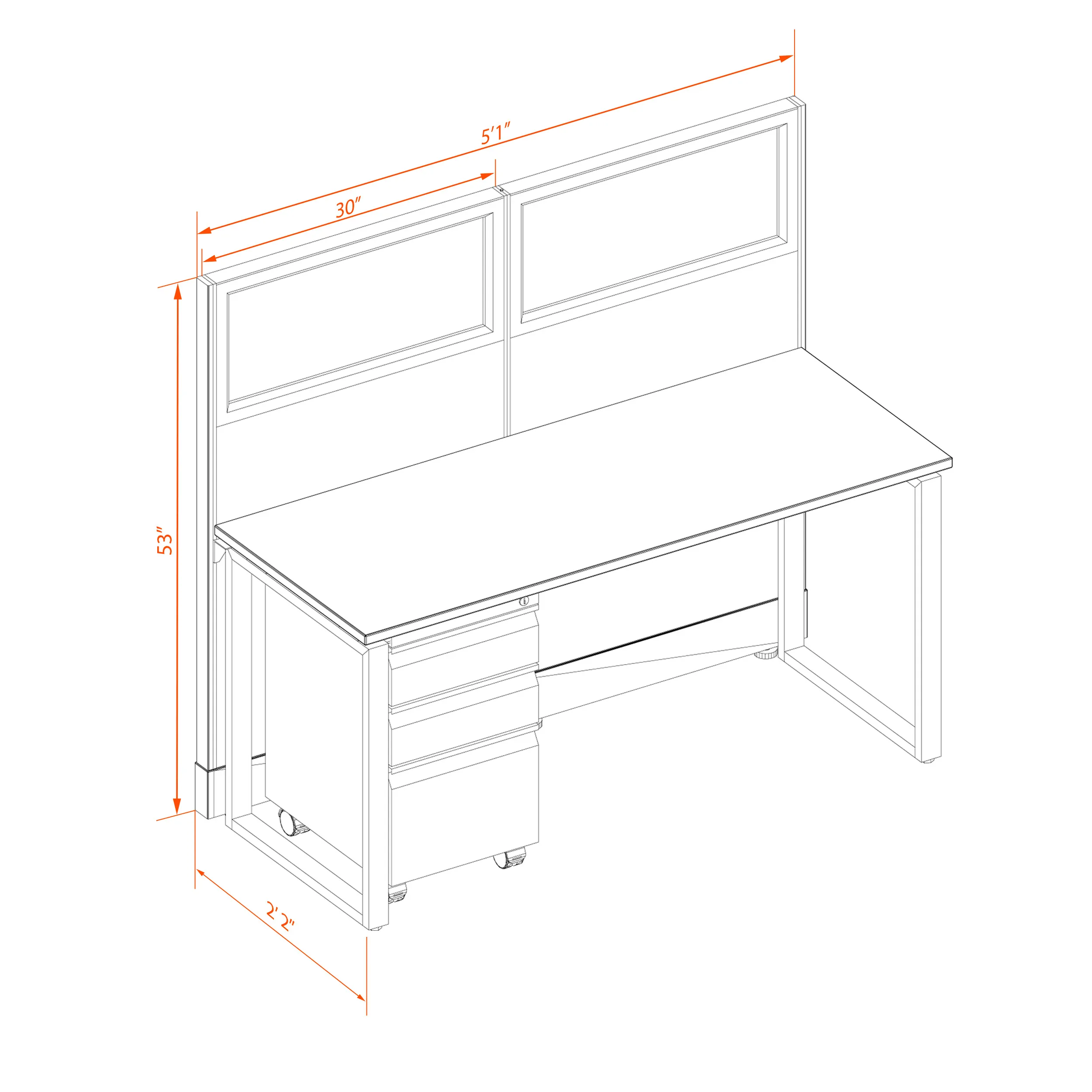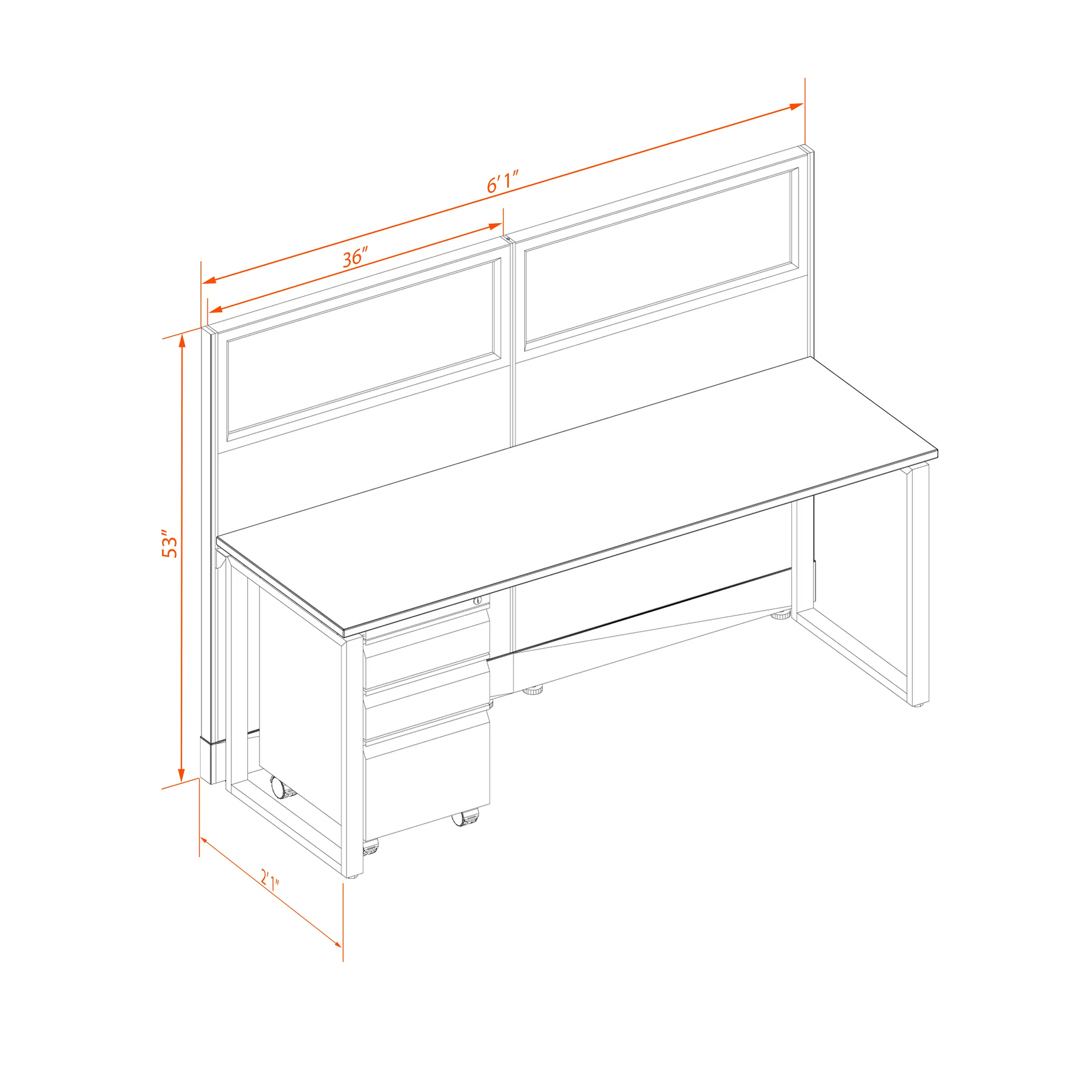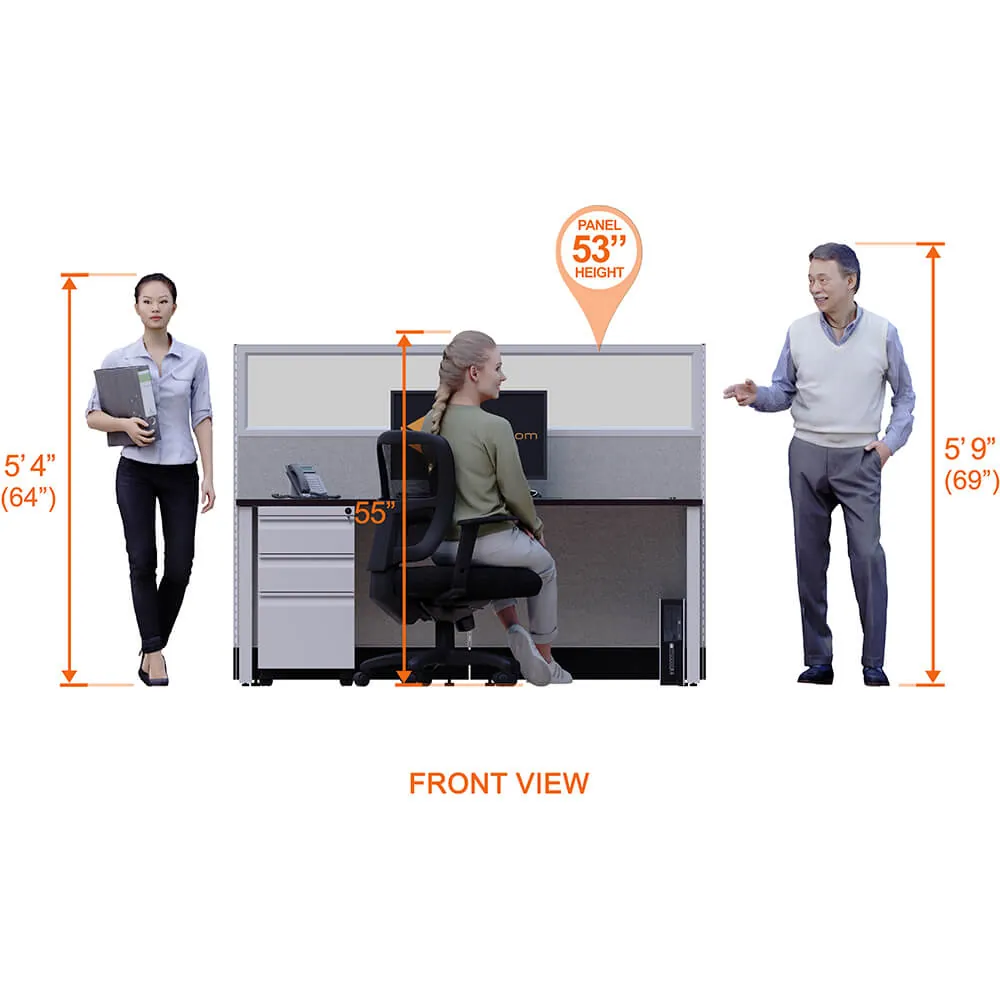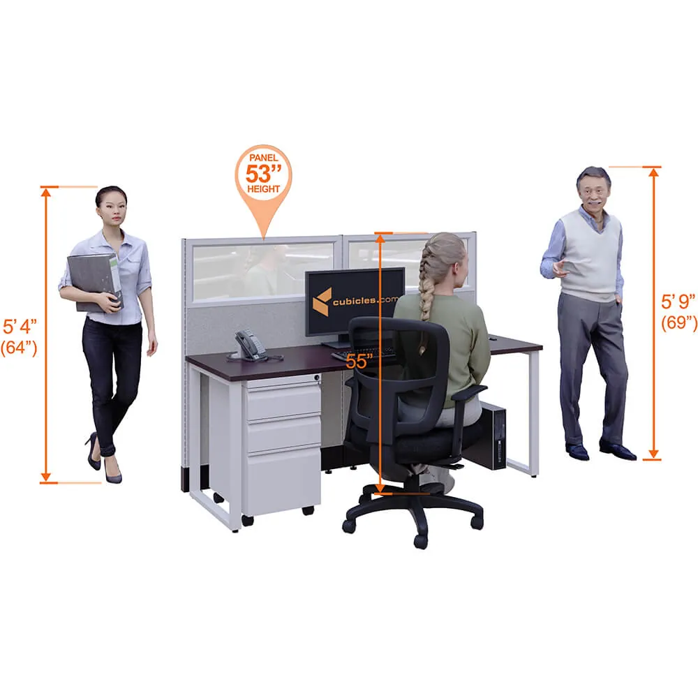 This layout includes 1 station in a single arrangement, defined by 53”H walls with windows that provide a moderate boundary, structural support, and channels for network/data cables (plus electricity, if you buy the powered model). Desk widths can be 60” or 72”.