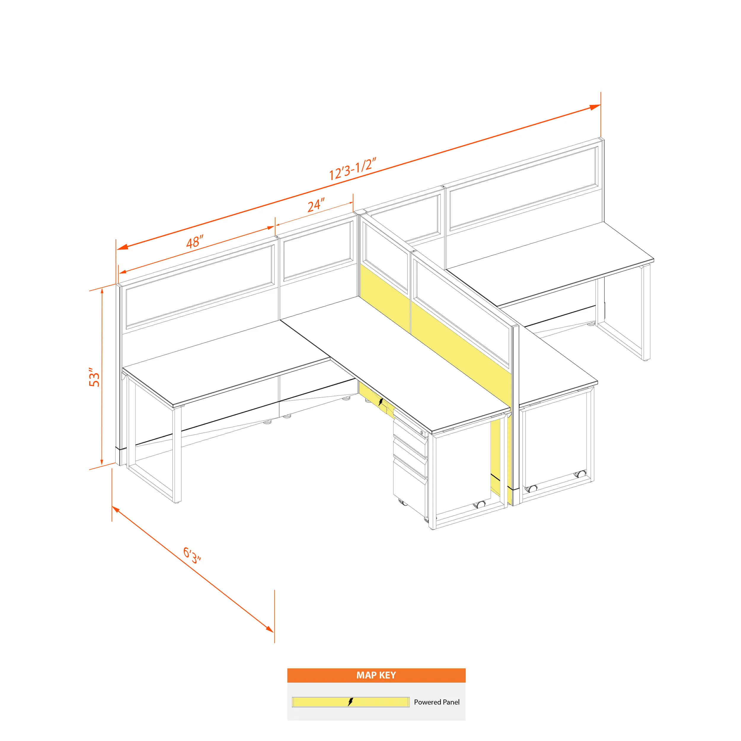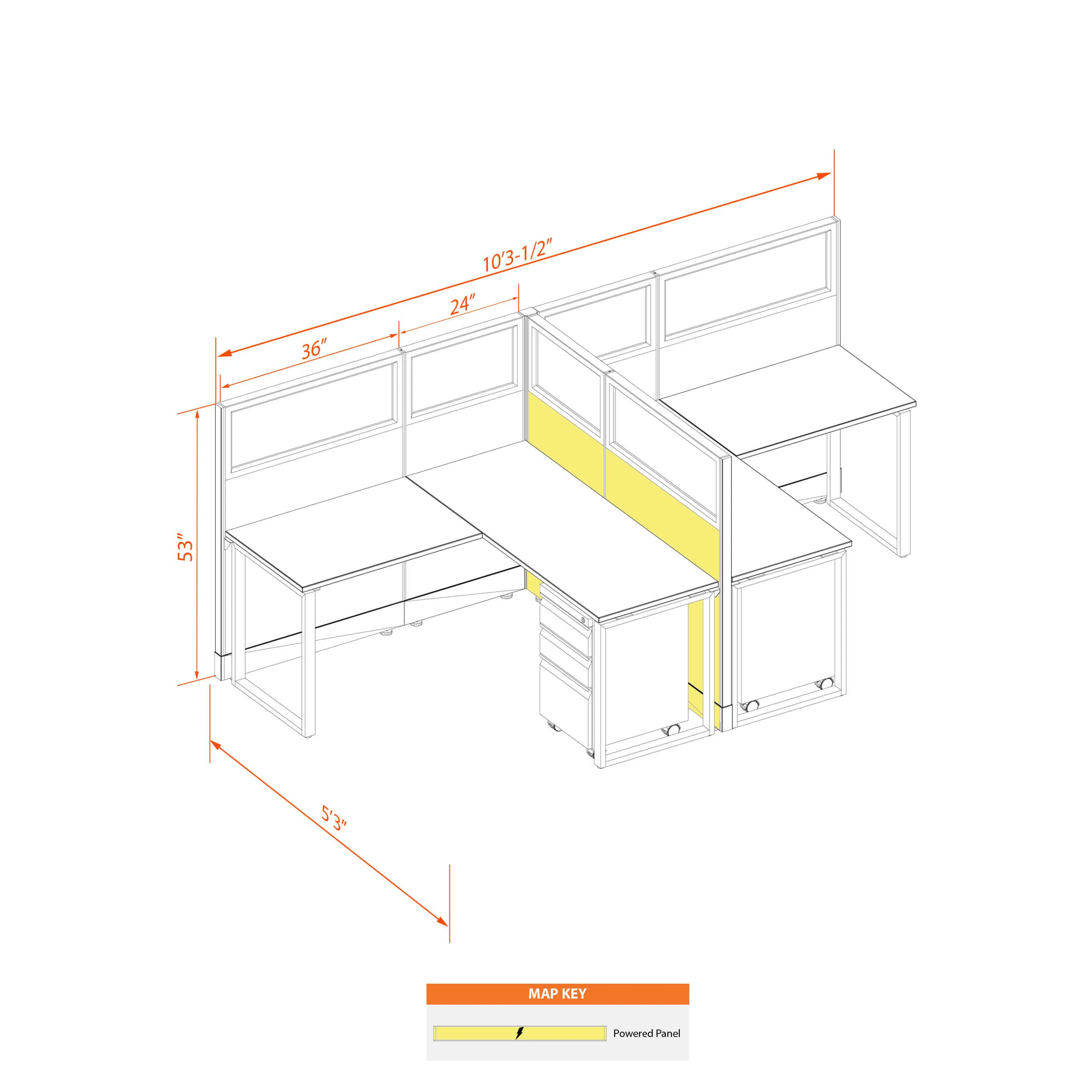 This configuration includes 2 stations in a mirrored arrangement (facing each other), defined by 53”H cubicle walls with windows that provide moderate boundaries, structural support, and channels for network/data cables (plus electricity, if you buy the powered model). Desk widths can be 60” or 72”.