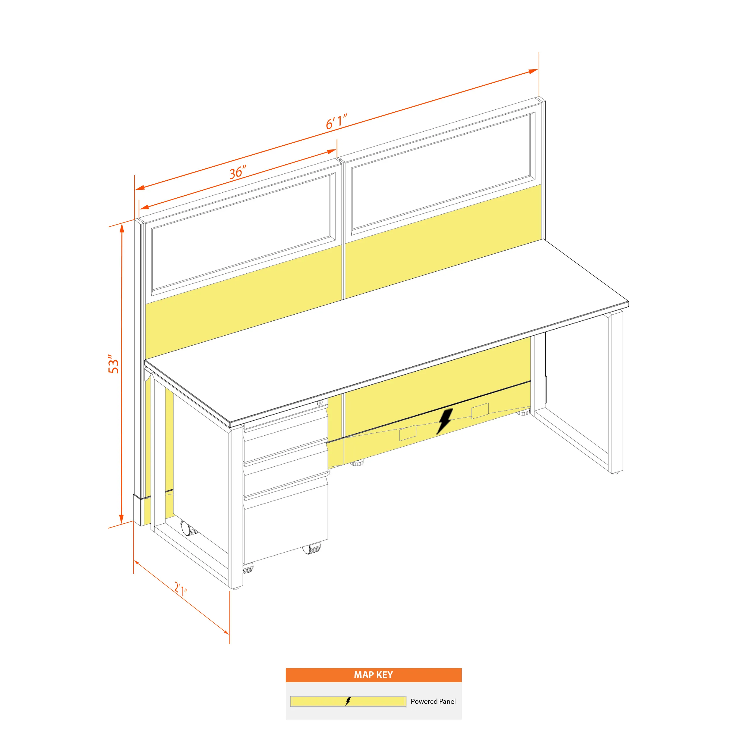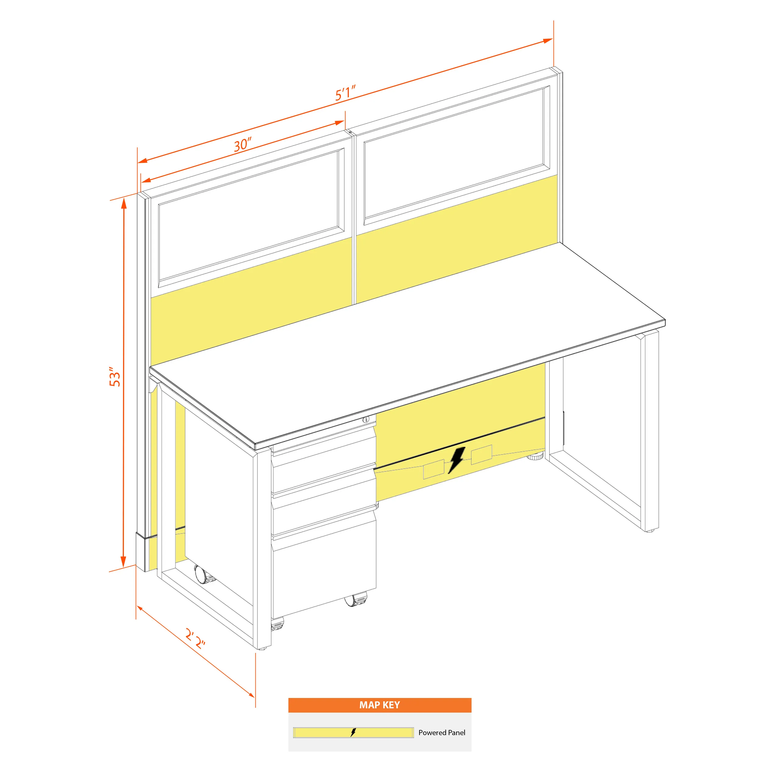 This layout includes 1 station in a single arrangement, defined by 53”H walls with windows that provide a moderate boundary, structural support, and channels for network/data cables (plus electricity, if you buy the powered model). Desk widths can be 60” or 72”.
