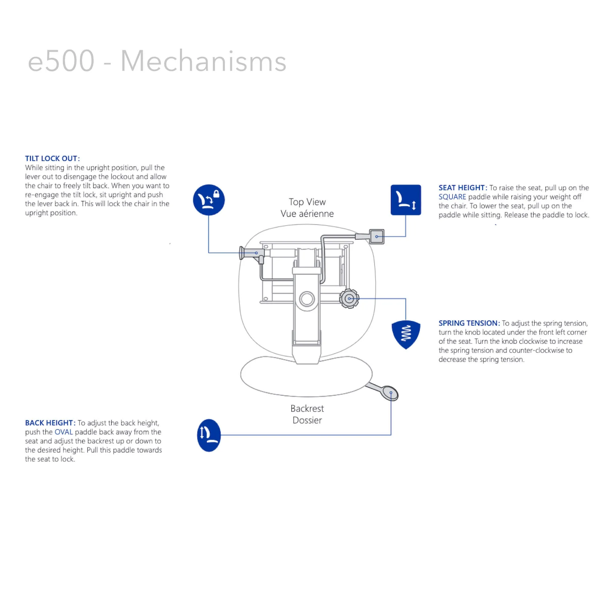 Tilt mechanism with a single position seat tilt lock out, adjustable spring tension and synchro 2:1 ratio.
