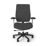 This heavy duty chair is available in two upholstery colors: black or gray fabric, both paired with a black frame, base, and armrests. It features a durable ply hardwood seat structure and heavy-duty polyurethane foam for enhanced comfort and support.