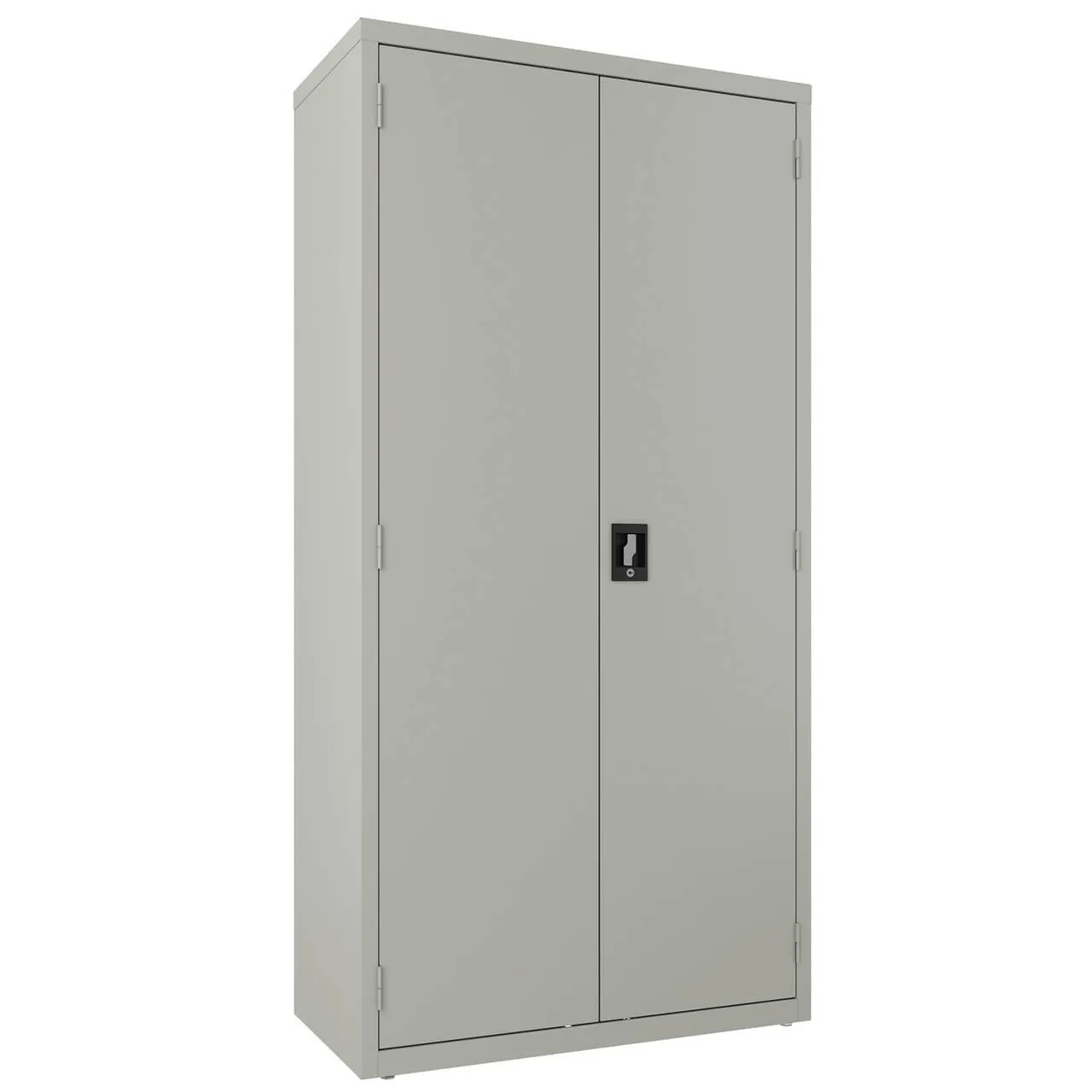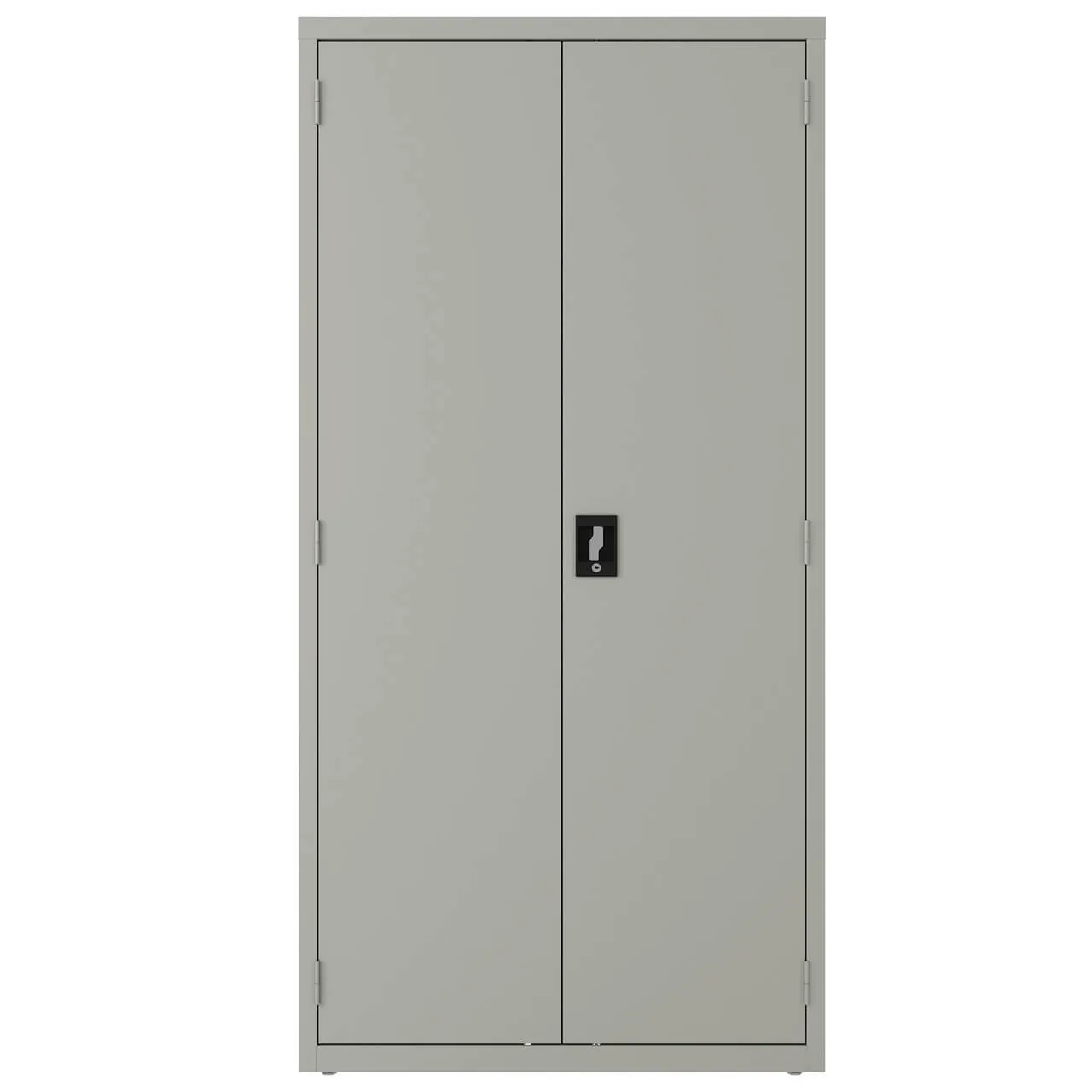 It features one full-width fixed shelf that supports up to 180 lbs, three half-width adjustable shelves (moving in 1" increment) with 90 lbs capacity each, and a hanging rod. A recessed handle with a core-removable lock provides a three-point locking system that locks the top, bottom, and doors.