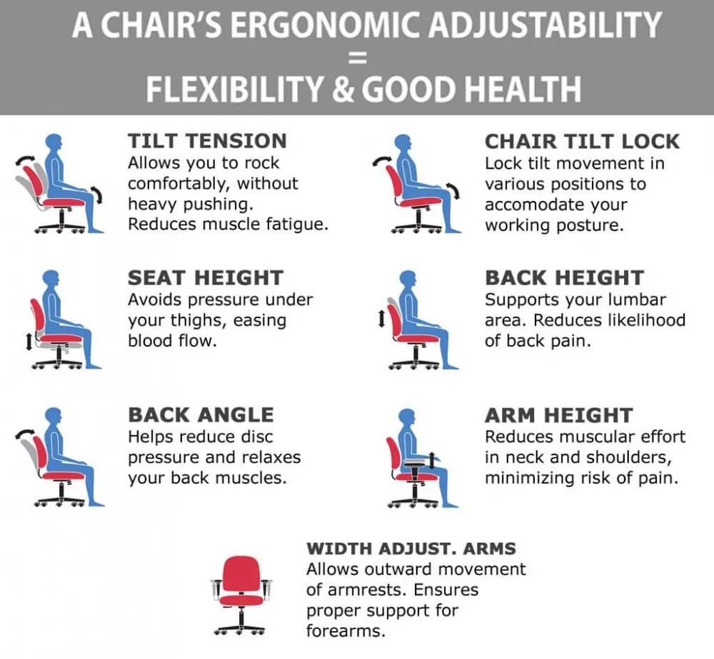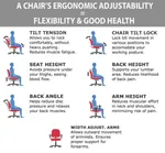 Adjustable ergonomic chair features that can encourage health and wellness in the workplace: Arm pads adjust inward/outward and upward/downward, Backrest height adjustment, Backrest tilt angle adjustment at 90º, 100º, and 110º, Ratchet back, Seat height and tension adjustment, Seat slider - making this a very comfortable ergonomic mesh office chair that will support you during long days at the office.