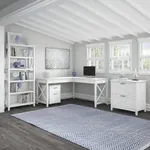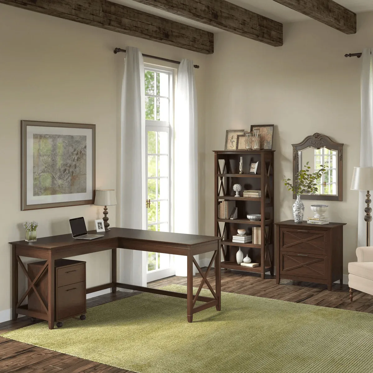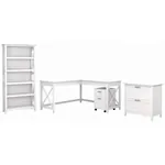 Bundle includes: 60x60 L Shaped Desk, 2 Drawer Mobile File Cabinet, 2 Drawer Lateral File Cabinet, Tall 5 Shelf Bookcase.