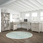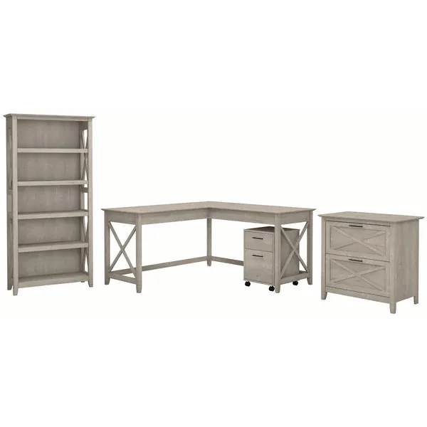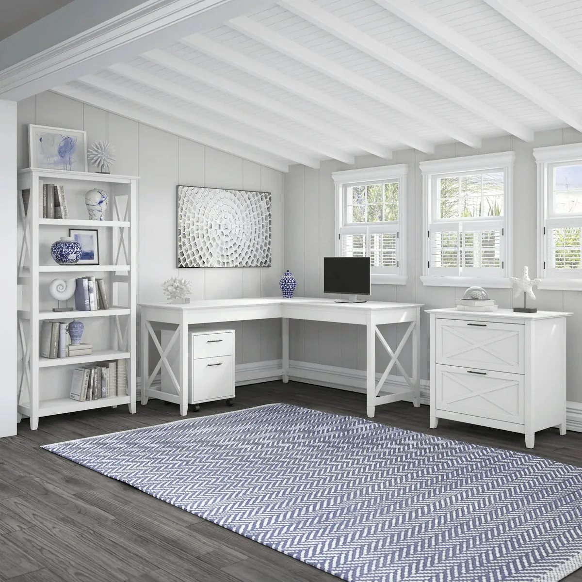 Our Wooden Office Furniture Set comes with a wood L shaped office desk, a pedestal with wheels, a 2 drawer lateral file cabinet and a 5 Shelf Bookcase. This set allows to create an office even in small spaces without compromising comfort. The wooden L-shaped desk can be positioned in a corner to maximize the office space available or, with its fully finished back, can serve as a striking focal point in the room. The mobile file cabinet fits under the office L desk and with its front-locking casters it can be securely placed where needed. As convenient office storage solutions, this set comes with a 5 shelf wooden bookcase and a 30 inch wide 2 drawer lateral file cabinet. With its blend of functionality, compact design, and charming coastal or farmhouse style, this wooden office furniture set is an ideal choice to create a comfortable and stylish workspace in any setting.