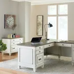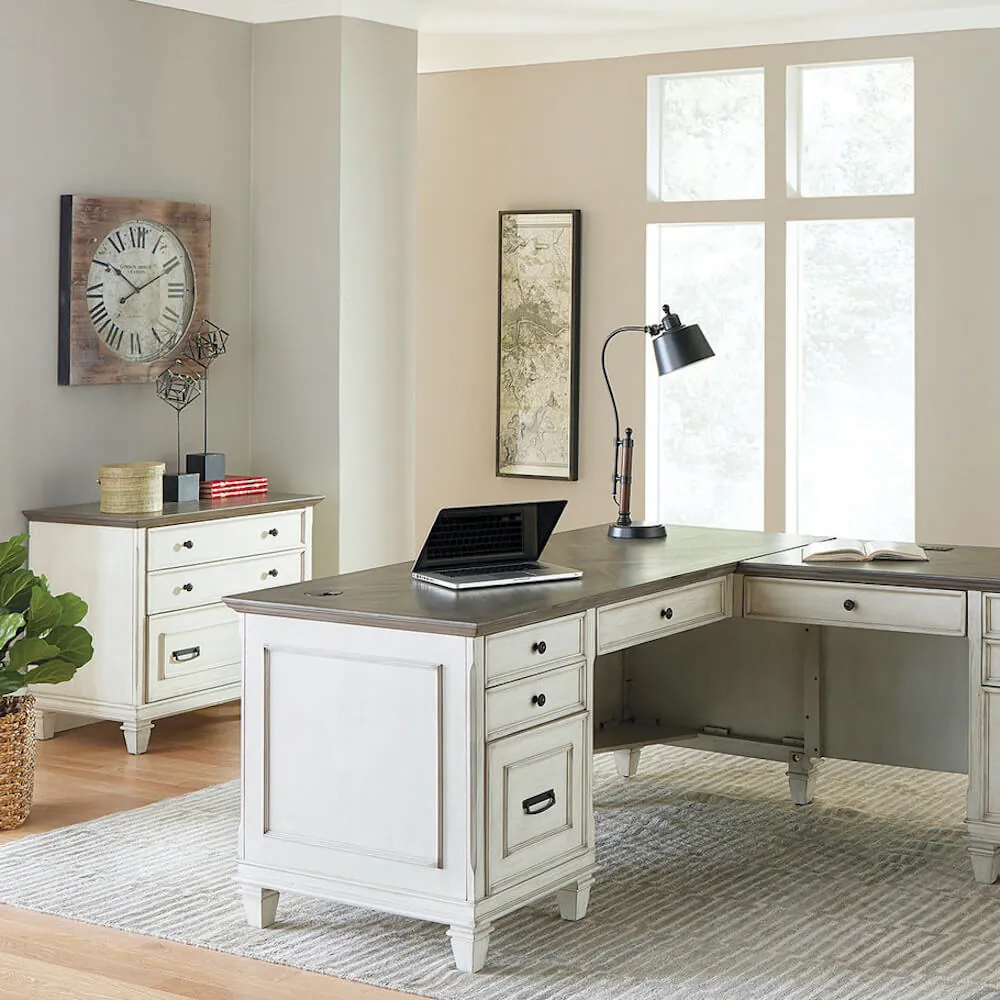 The vintage L-shaped desk offers an executive-style design with a unique retro yet stylish look. It features a distressed finish and ample storage space both underneath and in conjunction with the vintage file cabinet, making them an ideal choice for recreating an antique atmosphere in your office.