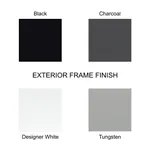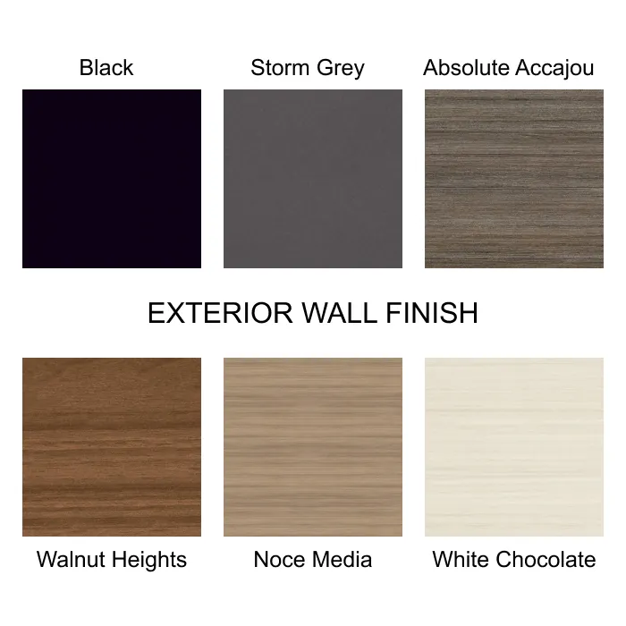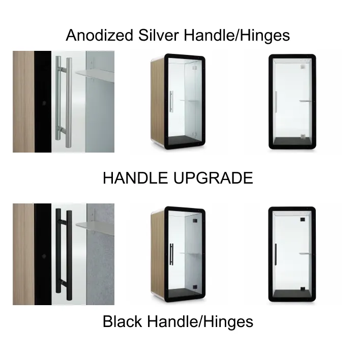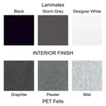 The internal frame comprises of 14-gauge steel beams, cladded with a 3⁄4" thermally fused laminate exterior, rounded off with an extruded aluminum corner detail. The privacy booth ceiling and shelf is in Designer White Laminate, whilst the interior carpet comprises of eco-friendly nylon fiber, solution dyed with a polypropylene backing. The door is tempered glass with a magnetic closure. Personalise your office privacy booth, to blend in with the rest of your creative office environment. For the exterior walls, we offer 6 laminate finishes and for the exterior frame, 4 paint colors. The interior can be finished in a laminate (for easy cleaning) or PET Felt (for industry-leading sound absorbing privacy), both having 3 color options each. The office pod comes standard with Anodized Silver hinge/handle trim, with the option to upgrade too Black, at no extra cost. The laminate back panel (POD1L) will be matched with your exterior wall laminate. The feature image displays two Booths, with their exterior in Noce Medio. On the Left, the interior is finished in a Designer White laminate and Silver anodized handle/hinges, and on the Right, with the PET Felt Mist interior and Black handle/hinges.