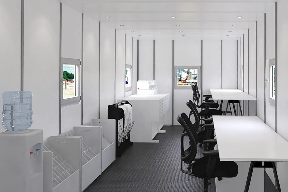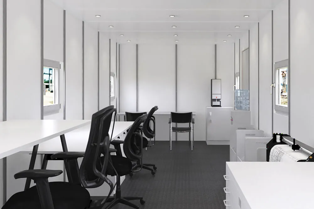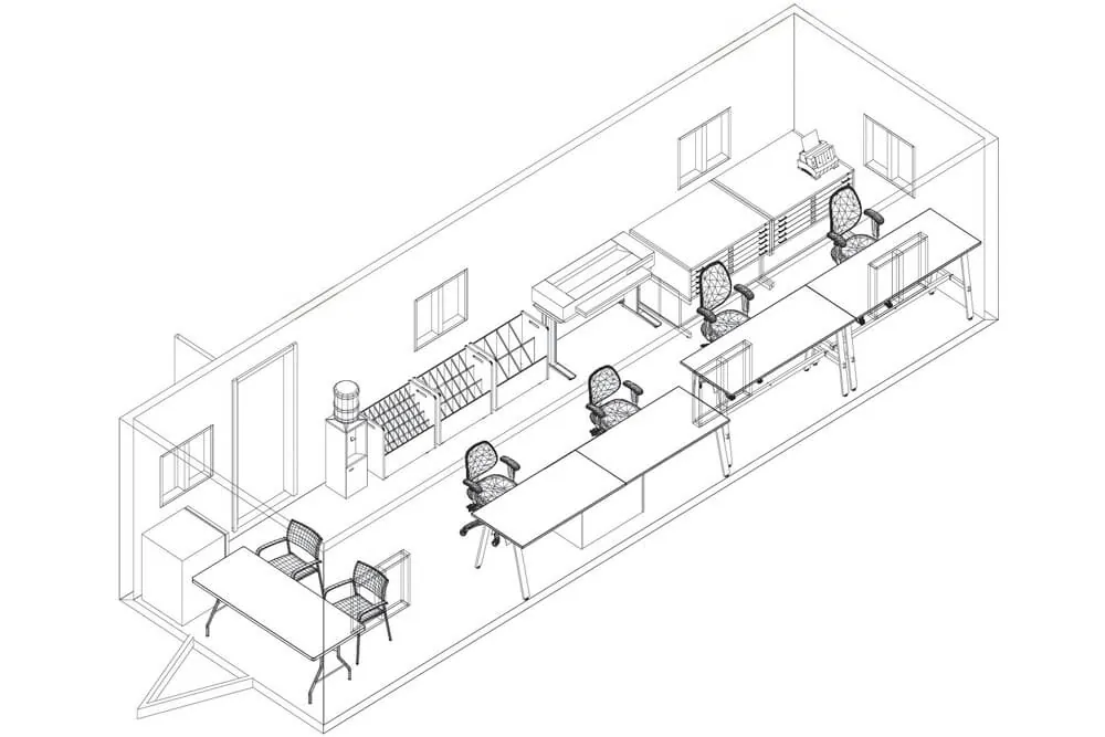 The Engineering Trailer is an office trailer interior specifically tailored for engineers and architects, optimized to meet the unique demands of design and planning projects. Key features include a professional drafting table, drafting stools; ideal to perform daily design-related tasks with great comfort. As a convenient architectural plan storage solution, this mobile office space features a blueprint file cabinet, and a mobile roll file unit. Each element is thoughtfully selected to create a productive workspace that supports the needs of those who design, plan, and build, ensuring an efficient and organized construction jobsite trailer environment.