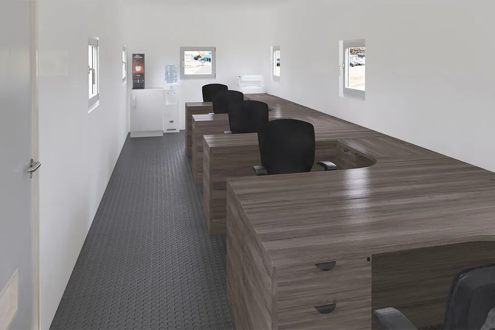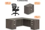 This administrative office furniture setup is meticulously designed to enhance efficiency and organization in key functions such as payroll, purchasing, ordering, and customer service within a business trailer, job site office trailer, or construction site office trailer. It features L-Shaped office desks with storage, each equipped with a file file and a box box file pedestal. A 36" wide, 2 drawer lateral file cabinet and five task office chairs complete the workspace, ensuring a productive and organized environment tailored to the needs of administrative professionals.
