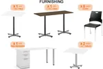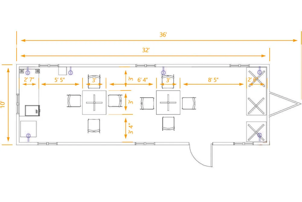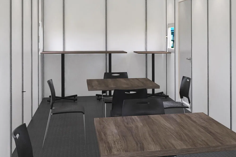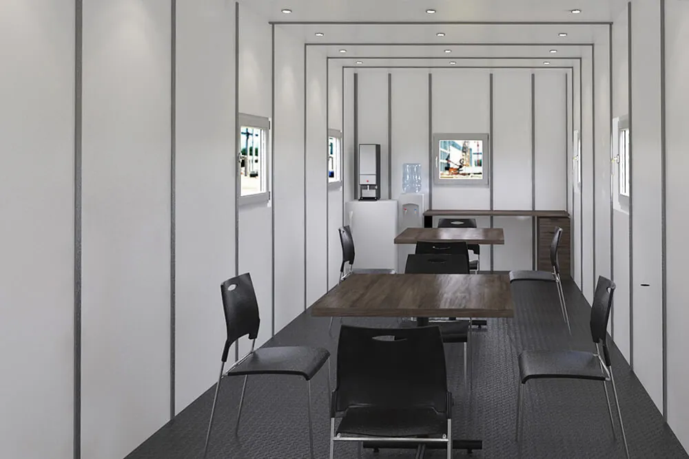 Our Portable Break Room is thoughtfully designed to offer a comfortable retreat for employees, ideal for relaxation and socialization during breaks. The inviting space features a well-equipped pantry area with two 36” pantry tables for casual gatherings, a 30” office bar height table for quick breaks, a 30”x72” tall table for larger groups, and a 70”x30” straight desk with a box box file pedestal that combines dining with functional storage. With eight stackable office chairs, this trailer provides flexible seating options, creating a rejuvenating environment where employees can unwind and recharge in style.